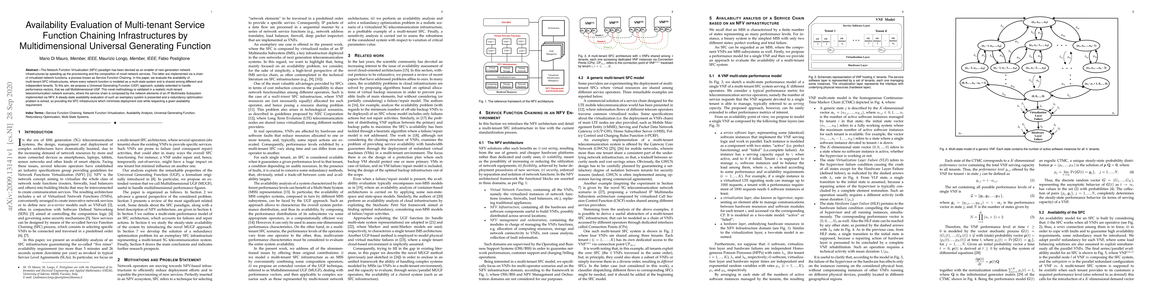 This paper evaluates the availability of multi-tenant Service Function Chaining (SFC) infrastructures using a Multidimensional Universal Generating Function (UGF) approach. The proposed methodology optimizes redundancy to minimize deployment costs while meeting specified availability requirements in a realistic telecommunication network scenario.