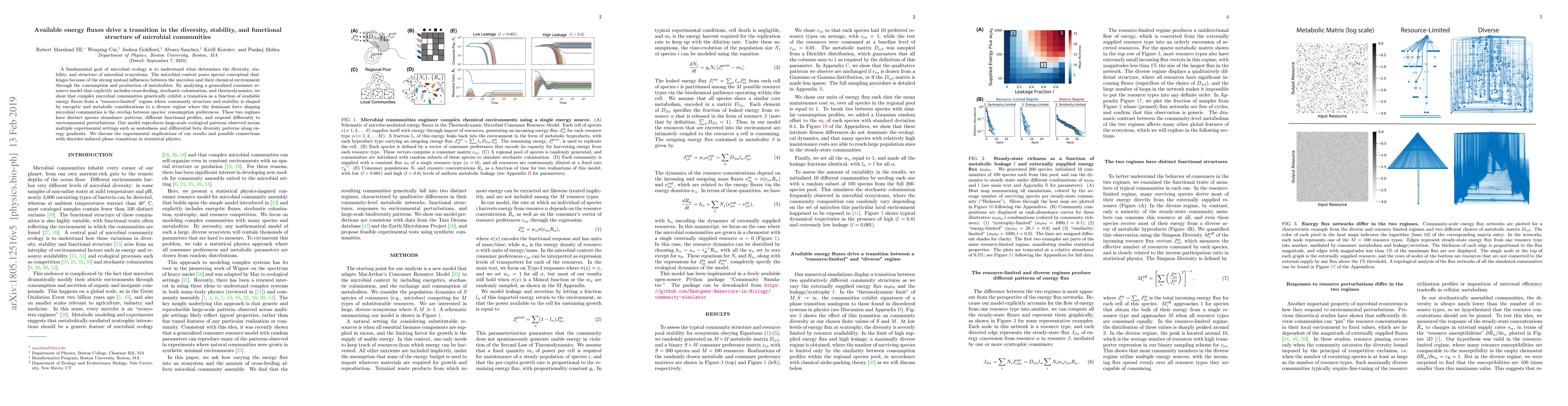 This paper demonstrates that microbial communities transition in diversity, stability, and functional structure based on available energy fluxes, shifting from a resource-limited regime to a diverse regime shaped by species consumption preferences. The model accurately captures observed ecological patterns and suggests links to phase transitions in statistical physics.