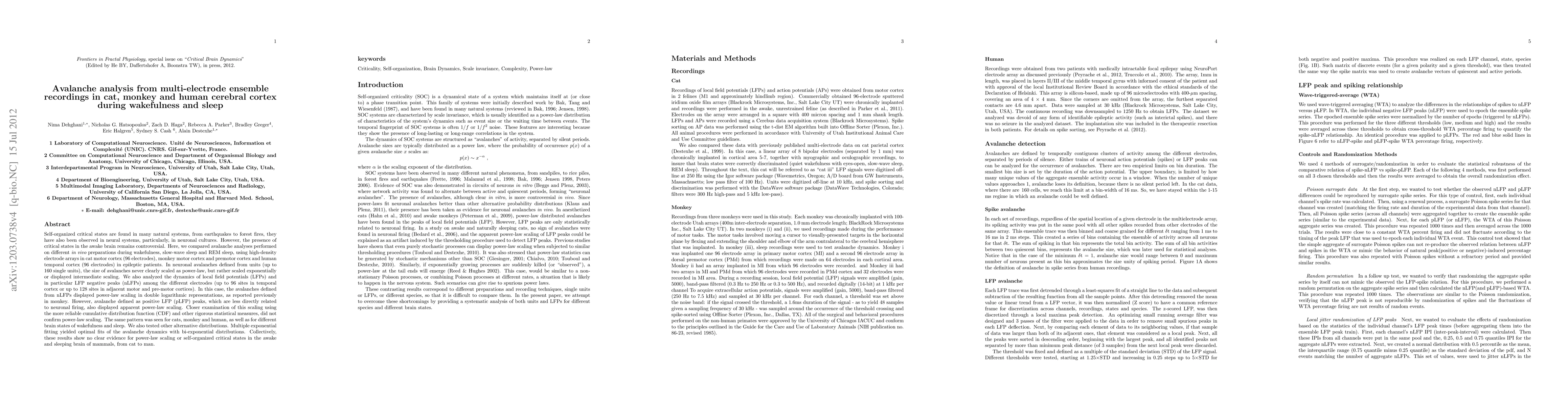 Self-organized critical states are found in many natural systems, from earthquakes to forest fires, they have also been observed in neural systems, particularly, in neuronal cultures. However, the presence of critical states in the awake brain remains controversial. Here, we compared avalanche analyses performed on different in vivo preparations during wakefulness, slow-wave sleep and REM sleep, using high-density electrode arrays in cat motor cortex (96 electrodes), monkey motor cortex and premotor cortex and human temporal cortex (96 electrodes) in epileptic patients. In neuronal avalanches defined from units (up to 160 single units), the size of avalanches never clearly scaled as power-law, but rather scaled exponentially or displayed intermediate scaling. We also analyzed the dynamics of local field potentials (LFPs) and in particular LFP negative peaks (nLFPs) among the different electrodes (up to 96 sites in temporal cortex or up to 128 sites in adjacent motor and pre-motor cortices). In this case, the avalanches defined from nLFPs displayed power-law scaling in double log representations, as reported previously in monkey. However, avalanche defined as positive LFP (pLFP) peaks, which are less directly related to neuronal firing, also displayed apparent power-law scaling. Closer examination of this scaling using more reliable cumulative distribution functions (CDF) and other rigorous statistical measures, did not confirm power-law scaling. The same pattern was seen for cats, monkey and human, as well as for different brain states of wakefulness and sleep. We also tested other alternative distributions. Multiple exponential fitting yielded optimal fits of the avalanche dynamics with bi-exponential distributions. Collectively, these results show no clear evidence for power-law scaling or self-organized critical states in the awake and sleeping brain of mammals, from cat to man.