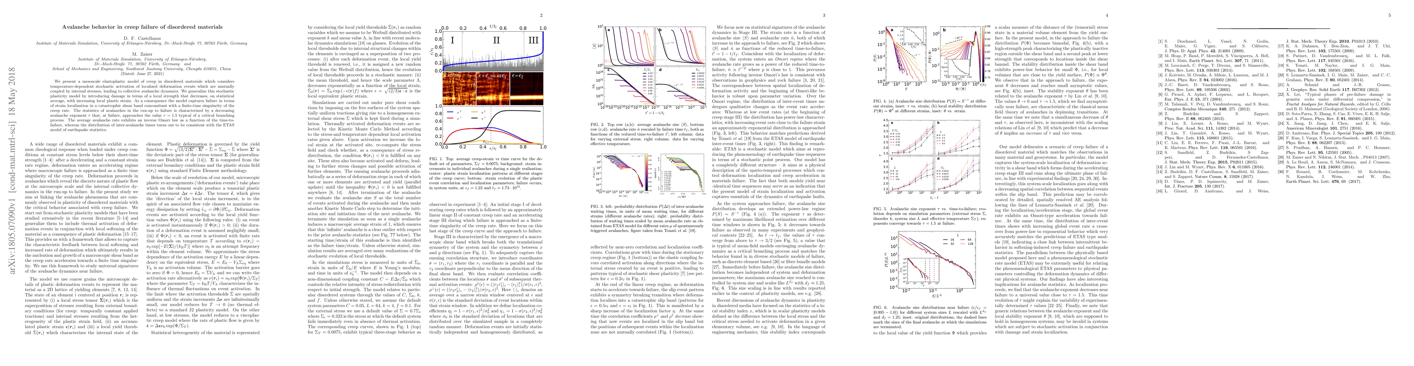 This paper develops a mesoscale elastoplastic model for creep in disordered materials, incorporating temperature-dependent stochastic activation of deformation events and damage accumulation. The model predicts catastrophic failure through a shear band, characterized by a decreasing avalanche exponent approaching 1.5, and an inverse Omori law for the average avalanche rate.