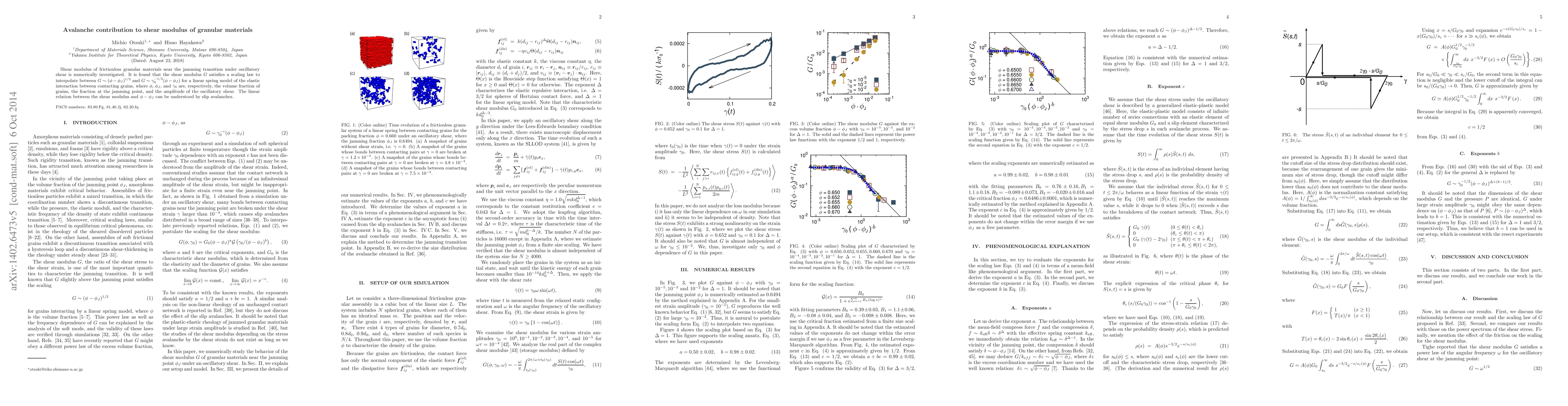 This paper investigates the shear modulus of frictionless granular materials near the jamming transition, revealing a scaling law that interpolates between two forms based on volume fraction and oscillatory shear amplitude. The findings suggest that slip avalanches contribute to the linear relationship between shear modulus and the difference between the current and jamming volume fractions.