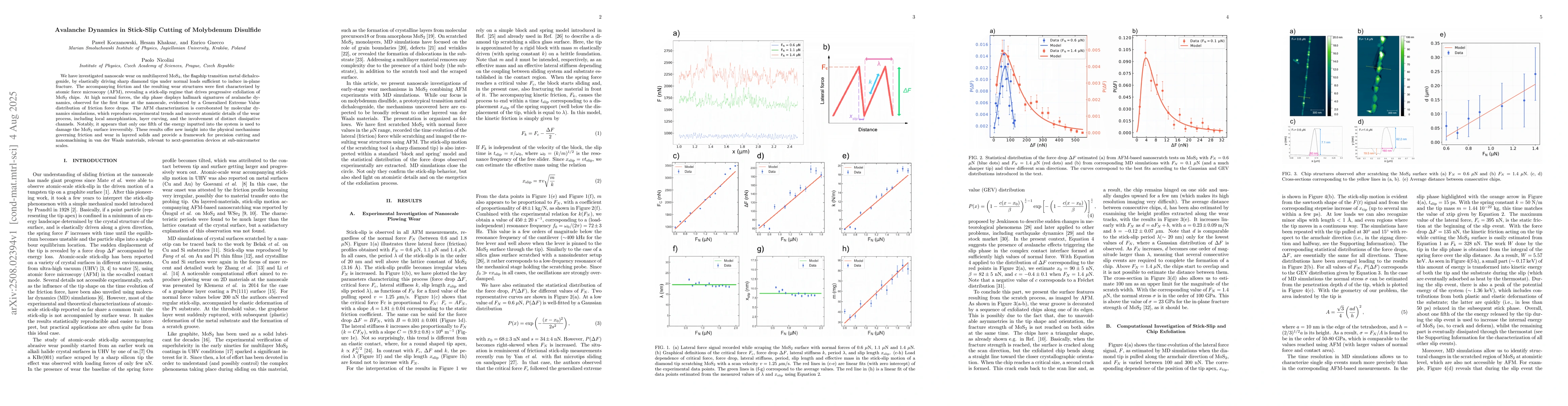 We have investigated nanoscale wear on multilayered MoS2, the flagship transition metal dichalcogenide, by elastically driving sharp diamond tips under normal loads sufficient to induce in-plane fracture. The accompanying friction and the resulting wear structures were first characterized by atomic force microscopy (AFM), revealing a stick-slip regime that drives progressive exfoliation of MoS2 chips. At high normal forces, the slip phase displays hallmark signatures of avalanche dynamics, observed for the first time at the nanoscale, evidenced by a Generalized Extreme Value distribution of friction force drops. The AFM characterization is corroborated by molecular dynamics simulations, which reproduce experimental trends and uncover atomistic details of the wear process, including local amorphization, layer curving, and the involvement of distinct dissipative channels. Notably, it appears that only one-fifth of the energy inputted into the system is used to damage the MoS2 surface irreversibly. These results offer new insight into the physical mechanisms governing friction and wear in layered solids and provide a framework for precision cutting and nanomachining in van der Waals materials, relevant to next-generation devices at sub-micrometer scales.