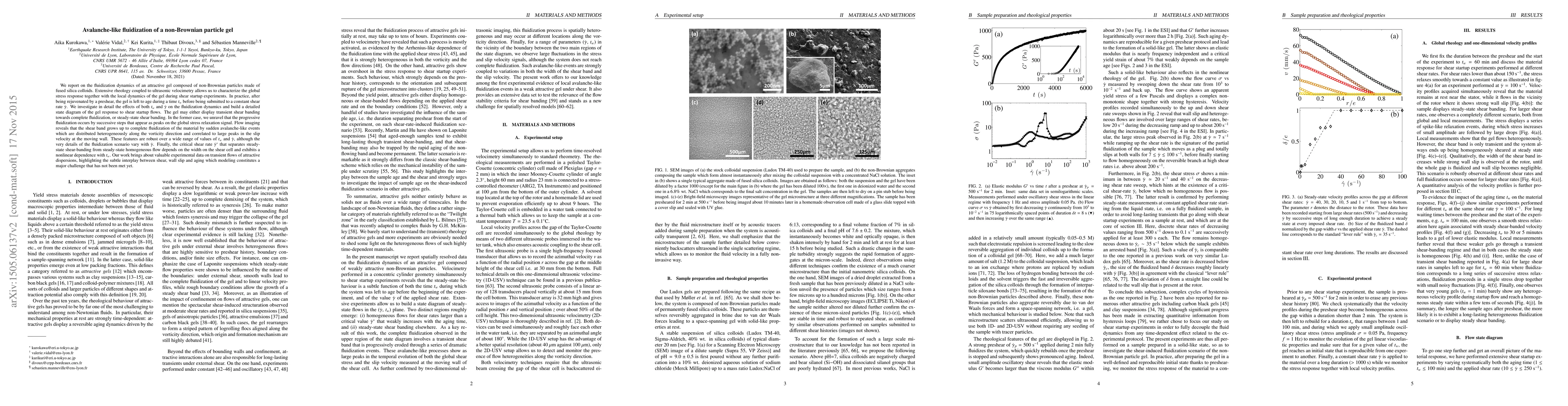We report on the fluidization dynamics of an attractive gel composed of non-Brownian particles made of fused silica colloids. Extensive rheology coupled to ultrasonic velocimetry allows us to characterize the global stress response together with the local dynamics of the gel during shear startup experiments. In practice, after being rejuvenated by a preshear, the gel is left to age during a time $t_w$ before being submitted to a constant shear rate $\dot \gamma$. We investigate in detail the effects of both $t_w$ and $\dot \gamma$ on the fluidization dynamics and build a detailed state diagram of the gel response to shear startup flows. The gel may either display transient shear banding towards complete fluidization, or steady-state shear banding. In the former case, we unravel that the progressive fluidization occurs by successive steps that appear as peaks on the global stress relaxation signal. Flow imaging reveals that the shear band grows up to complete fluidization of the material by sudden avalanche-like events which are distributed heterogeneously along the vorticity direction and correlated to large peaks in the slip velocity at the moving wall. These features are robust over a wide range of values of $t_w$ and $\dot \gamma$, although the very details of the fluidization scenario vary with $\dot \gamma$. Finally, the critical shear rate $\dot \gamma^*$ that separates steady-state shear-banding from steady-state homogeneous flow depends on the width on the shear cell and exhibits a nonlinear dependence with $t_w$. Our work brings about valuable experimental data on transient flows of attractive dispersions, highlighting the subtle interplay between shear, wall slip and aging which modeling constitutes a major challenge that has not been met yet.