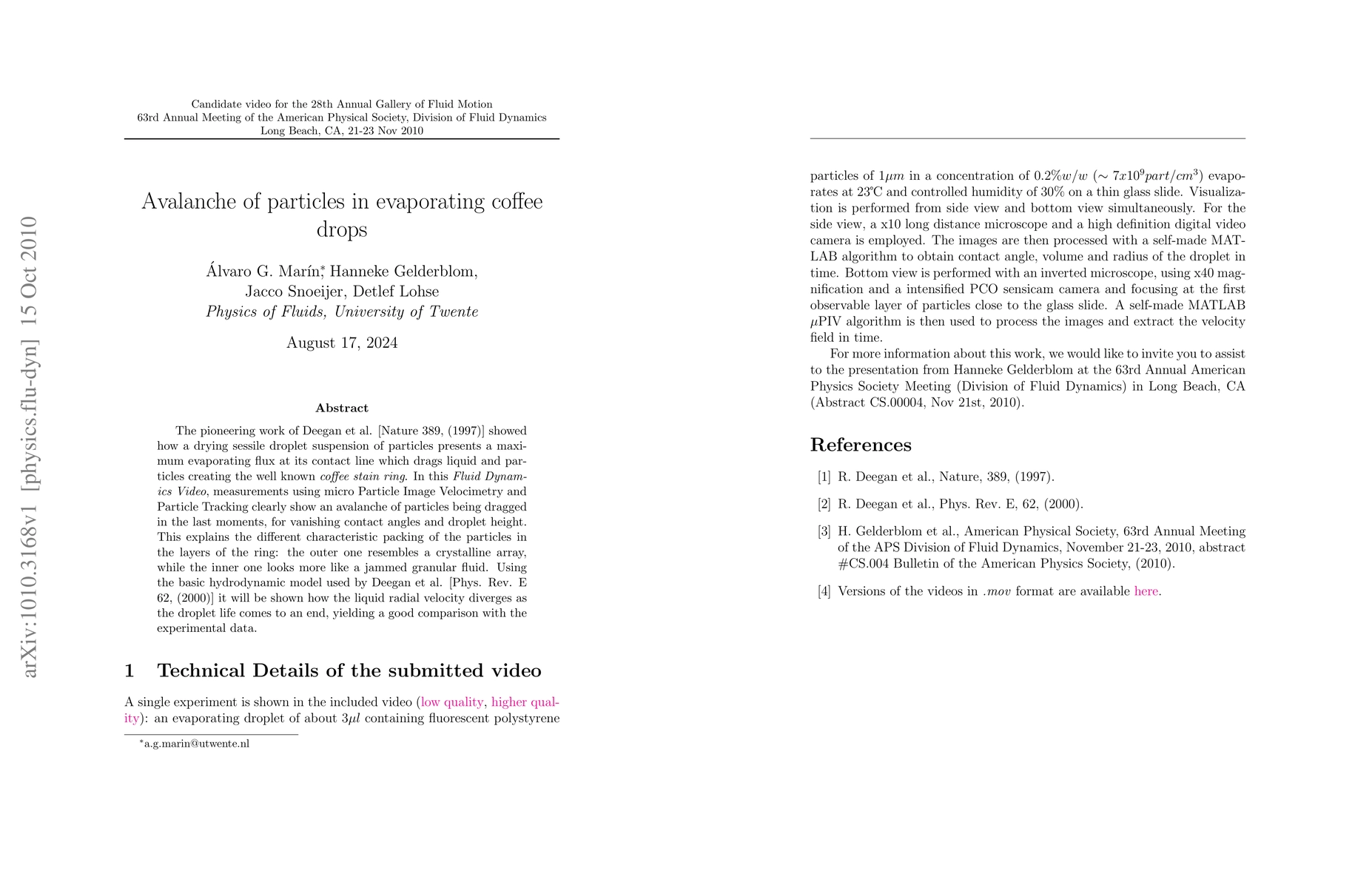 The pioneering work of Deegan et al. [Nature 389, (1997)] showed how a drying sessile droplet suspension of particles presents a maximum evaporating flux at its contact line which drags liquid and particles creating the well known coffee stain ring. In this Fluid Dynamics Video, measurements using micro Particle Image Velocimetry and Particle Tracking clearly show an avalanche of particles being dragged in the last moments, for vanishing contact angles and droplet height. This explains the different characteristic packing of the particles in the layers of the ring: the outer one resembles a crystalline array, while the inner one looks more like a jammed granular fluid. Using the basic hydrodynamic model used by Deegan et al. [Phys. Rev. E 62, (2000)] it will be shown how the liquid radial velocity diverges as the droplet life comes to an end, yielding a good comparison with the experimental data.