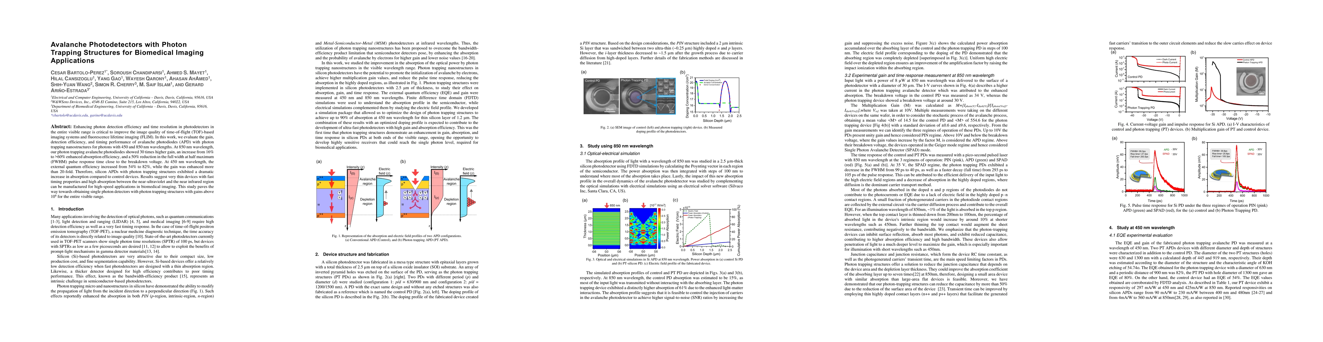 This study demonstrates silicon avalanche photodiodes with photon trapping nanostructures that significantly enhance photon detection efficiency and timing performance across the visible spectrum, showing a 30-fold gain and >60% absorption efficiency at 850 nm, and a 20-fold gain with 82% efficiency at 450 nm. The findings suggest potential for high-speed, thin biomedical imaging devices.