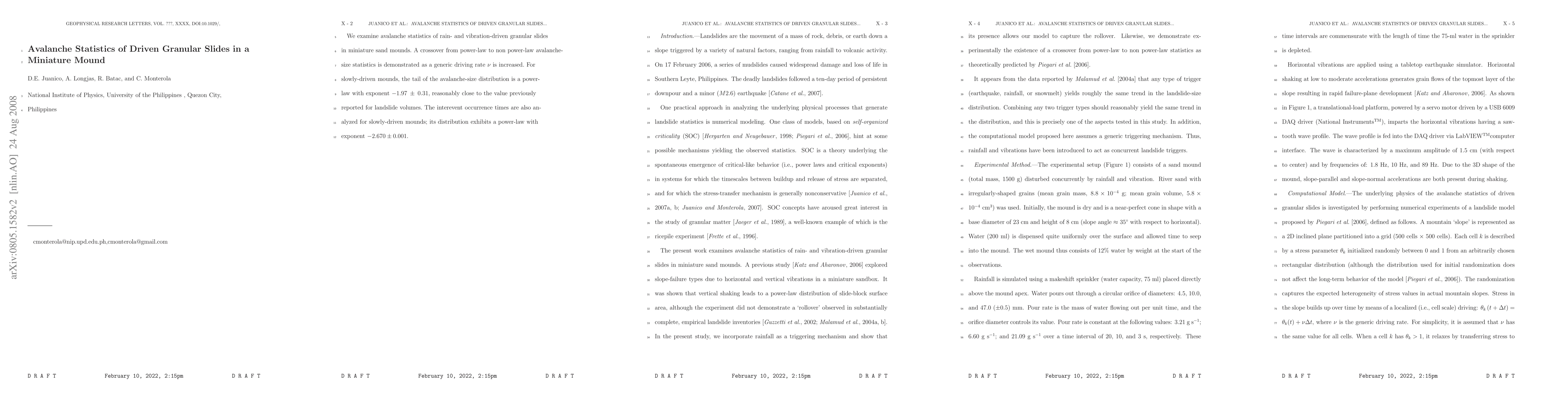 We examine avalanche statistics of rain- and vibration-driven granular slides in miniature sand mounds. A crossover from power-law to non power-law avalanche-size statistics is demonstrated as a generic driving rate $\nu$ is increased. For slowly-driven mounds, the tail of the avalanche-size distribution is a power-law with exponent $-1.97\pm 0.31$, reasonably close to the value previously reported for landslide volumes. The interevent occurrence times are also analyzed for slowly-driven mounds; its distribution exhibits a power-law with exponent $-2.670\pm 0.001$.
