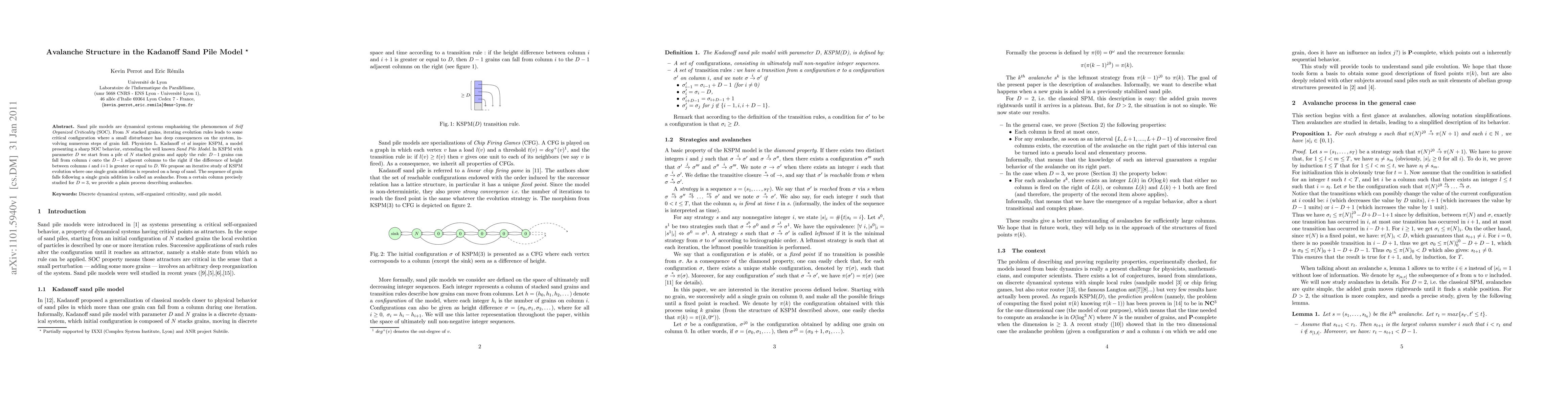 Sand pile models are dynamical systems emphasizing the phenomenon of Self Organized Criticality (SOC). From N stacked grains, iterating evolution rules leads to some critical configuration where a small disturbance has deep consequences on the system, involving numerous steps of grain fall. Physicists L. Kadanoff et al. inspire KSPM, a model presenting a sharp SOC behavior, extending the well known Sand Pile Model. In KSPM with parameter D we start from a pile of N stacked grains and apply the rule: D-1 grains can fall from column i onto the D-1 adjacent columns to the right if the difference of height between columns i and i+1 is greater or equal to D. We propose an iterative study of KSPM evolution where one single grain addition is repeated on a heap of sand. The sequence of grain falls following a single grain addition is called an avalanche. From a certain column precisely studied for D=3, we provide a plain process describing avalanches.