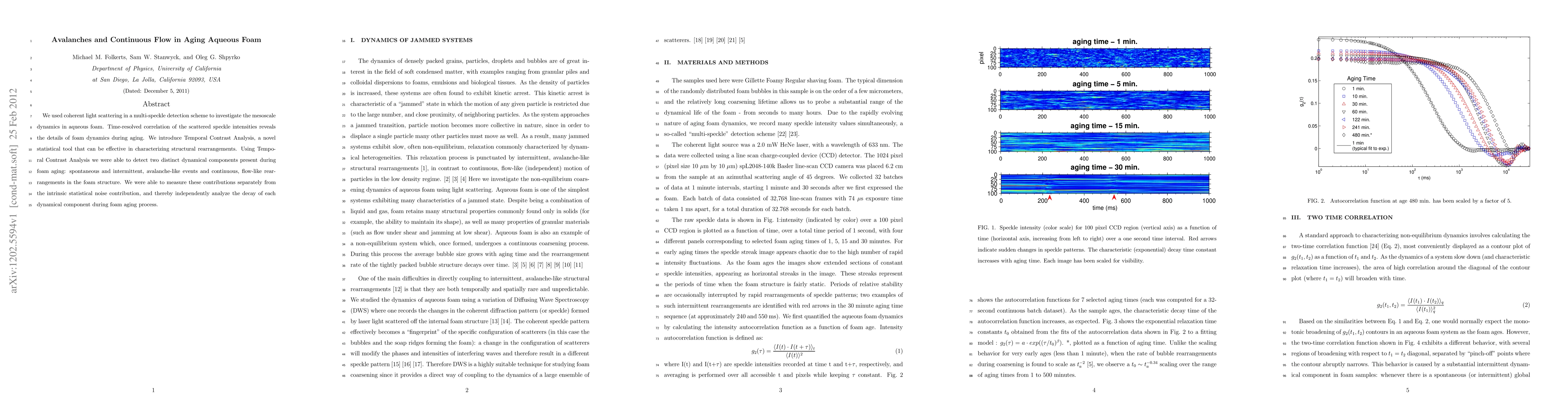 We used coherent light scattering in a multi-speckle detection scheme to investigate the mesoscale dynamics in aqueous foam. Time-resolved correlation of the scattered speckle intensities reveals the details of foam dynamics during aging. We introduce Temporal Contrast Analysis, a novel statistical tool that can be effective in characterizing structural rearrangements. Using Temporal Contrast Analysis we were able to detect two distinct dynamical components present during foam aging: spontaneous and intermittent, avalanche-like events and continuous, flow-like rearrangements in the foam structure. We were able to measure these contributions separately from the intrinsic statistical noise contribution, and thereby independently analyze the decay of each dynamical component during foam aging process.