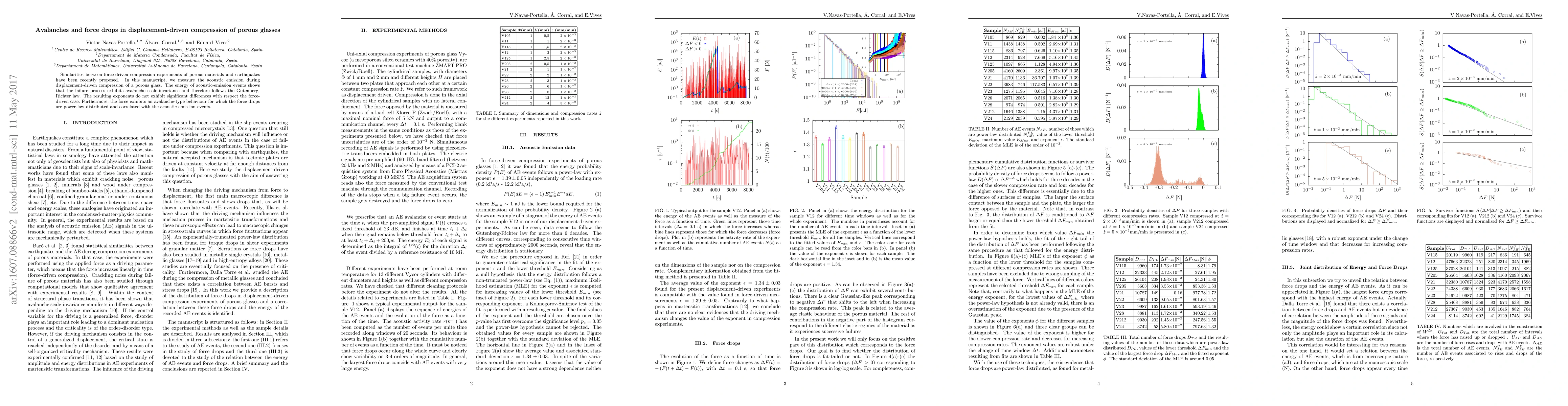 This study investigates the avalanche behavior during displacement-driven compression of porous glass, finding that the failure process follows the Gutenberg-Richter law, similar to force-driven compression, and that force drops exhibit power-law distribution correlated with acoustic emission events.