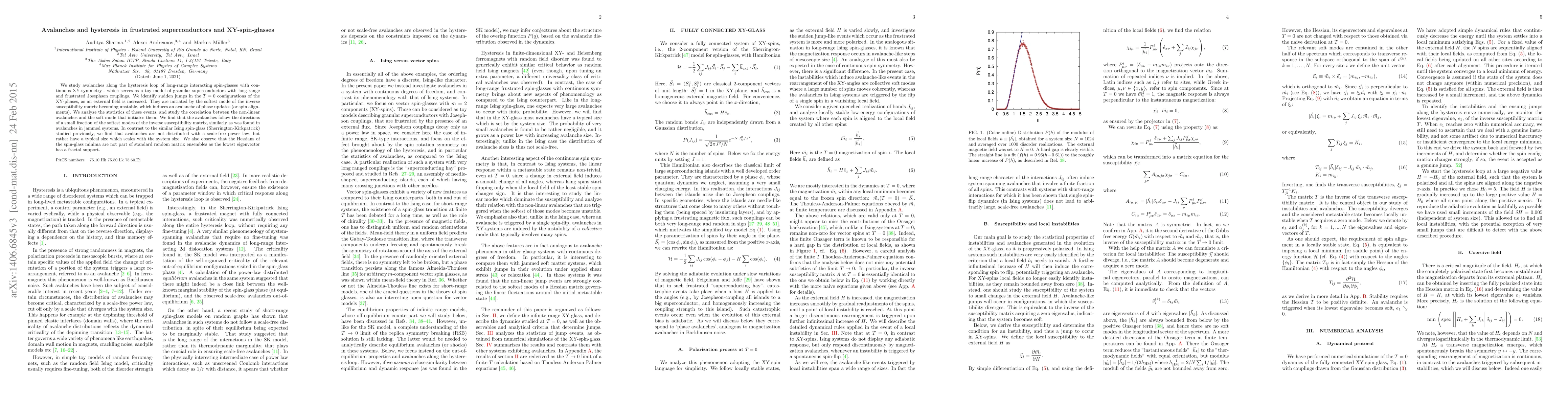 This paper investigates avalanche phenomena in frustrated superconductors modeled as long-range interacting spin-glasses, observing non-linear avalanches linked to the softest modes of the inverse susceptibility matrix. Unlike Ising spin-glasses, these avalanches do not follow a scale-free distribution but scale with system size, and the Hessians of spin-glass minima do not conform to standard random matrix ensembles.