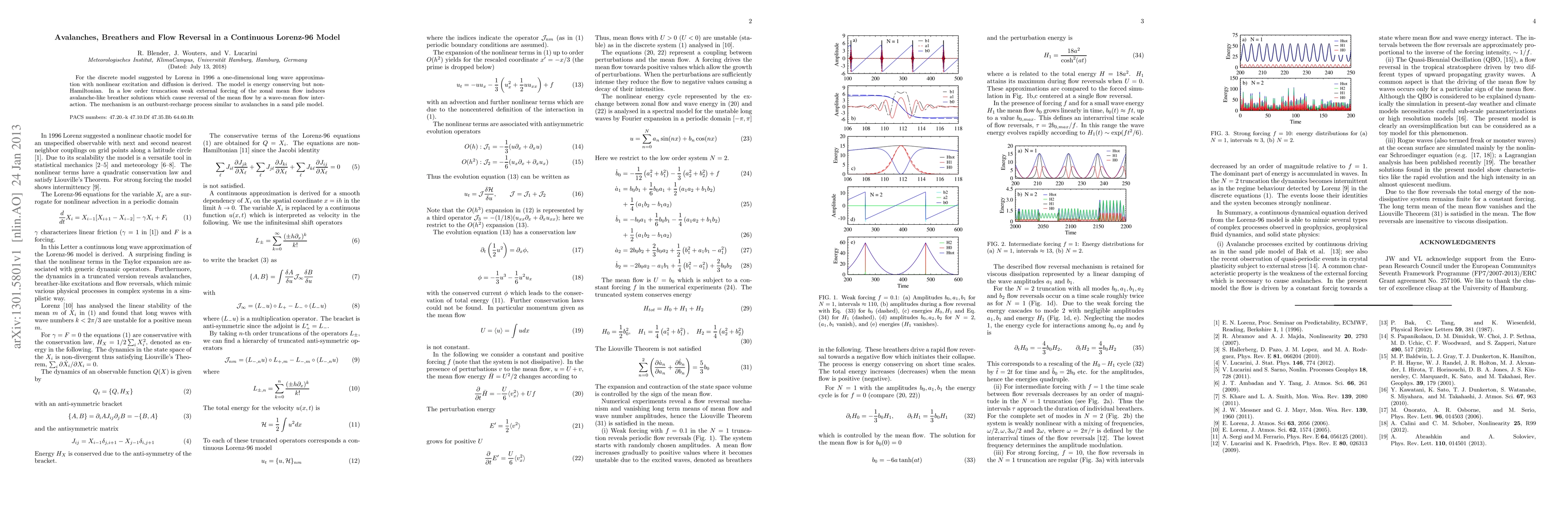 This paper explores a continuous Lorenz-96 model where weak external forcing induces avalanche-like breather solutions, leading to flow reversal through a wave-mean flow interaction akin to an outburst-recharge process in a sand pile model. The model is energy conserving but non-Hamiltonian.