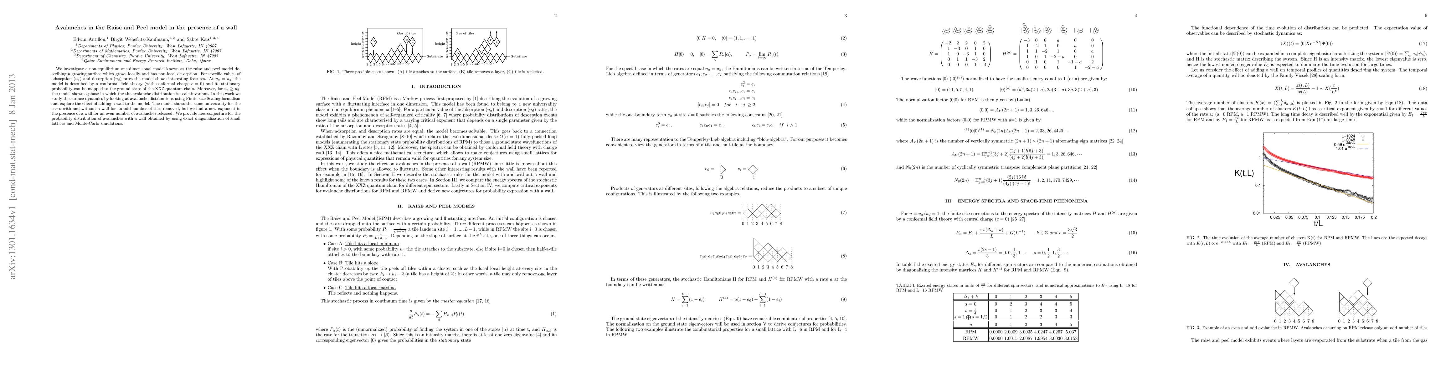 We investigate a non-equilibrium one-dimensional model known as the raise and peel model describing a growing surface which grows locally and has non-local desorption. For specific values of adsorption ($u_a$) and desorption($u_d$) rates the model shows interesting features. At $u_a = u_d$, the model is described by a conformal field theory (with conformal charge $c=0$) and its stationary probability canbe mapped to the ground state of the XXZ quantum chain. Moreover, for $u_a \geq u_d$, the model shows a phase in which the the avalanche distribution is scale invariant. In this work we study the surface dynamics by looking at avalanche distributions using Finite-size Scaling formalism and explore the effect of adding a wall to the model. The model shows the same universality for the cases with and without a wall for an odd number of tiles removed, but we find a new exponent in the presence of a wall for an even number of avalanches released. We provide new conjecture for the probability distribution of avalanches with a wall obtained by using exact diagonalization of small lattices and Monte-Carlo simulations.