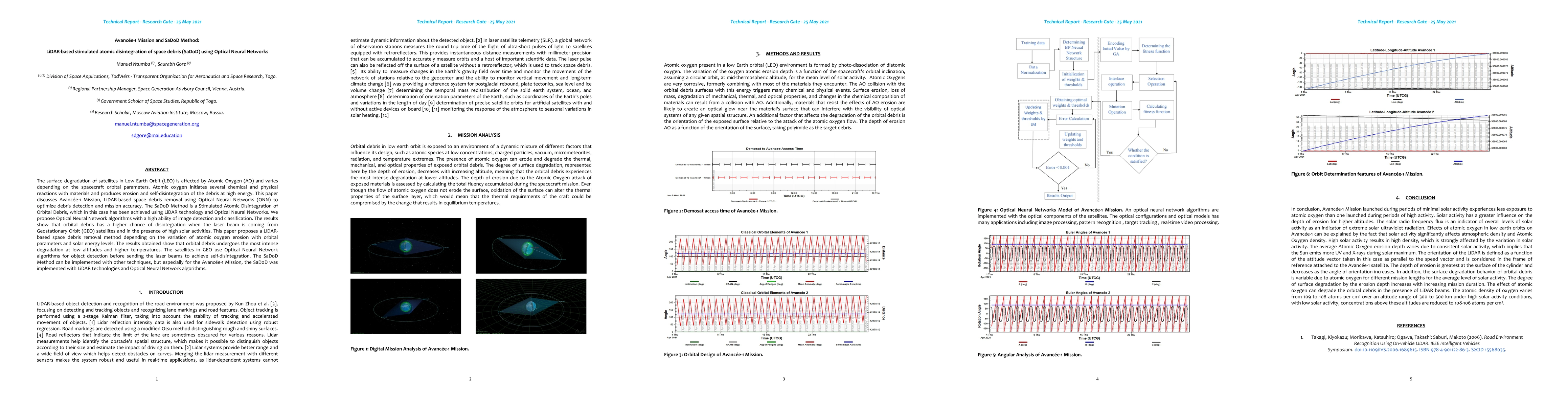 The surface degradation of satellites in Low Earth Orbit (LEO) is affected by Atomic Oxygen (AO) and varies depending on the spacecraft orbital parameters. Atomic oxygen initiates several chemical and physical reactions with materials and produces erosion and self-disintegration of the debris at high energy. This paper discusses Avancee-1 Mission, LiDAR-based space debris removal using Optical Neural Networks (ONN) to optimize debris detection and mission accuracy. The SaDoD Method is a Stimulated Atomic Disintegration of Orbital Debris, which in this case has been achieved using LiDAR technology and Optical Neural Networks. We propose Optical Neural Network algorithms with a high ability of image detection and classification. The results show that orbital debris has a higher chance of disintegration when the laser beam is coming from Geostationary Orbit (GEO) satellites and in the presence of high solar activities. This paper proposes a LiDAR-based space debris removal method depending on the variation of atomic oxygen erosion with orbital parameters and solar energy levels. The results obtained show that orbital debris undergoes the most intense degradation at low altitudes and higher temperatures. The satellites in GEO use Optical Neural Network algorithms for object detection before sending the laser beams to achieve self-disintegration. The SaDoD Method can be implemented with other techniques, but especially for the Avancee-1 Mission, the SaDoD was implemented with LiDAR technologies and Optical Neural Network algorithms.