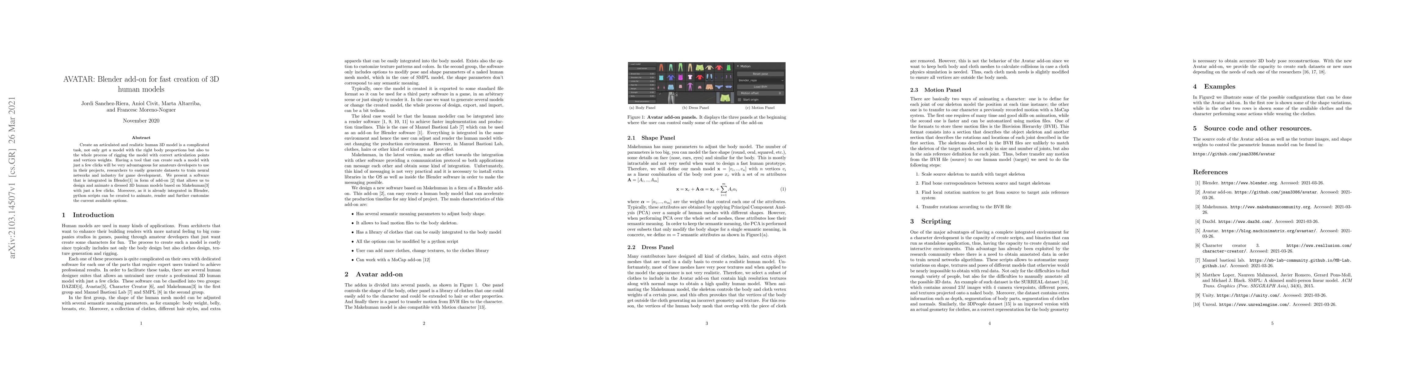 The AVATAR Blender add-on simplifies the creation of articulated and realistic 3D human models, enabling amateurs, researchers, and industry professionals to generate dressed human models with minimal effort and customization options via Python scripting. It leverages Makehuman for initial model design and integrates seamlessly within Blender for further animation and rendering.