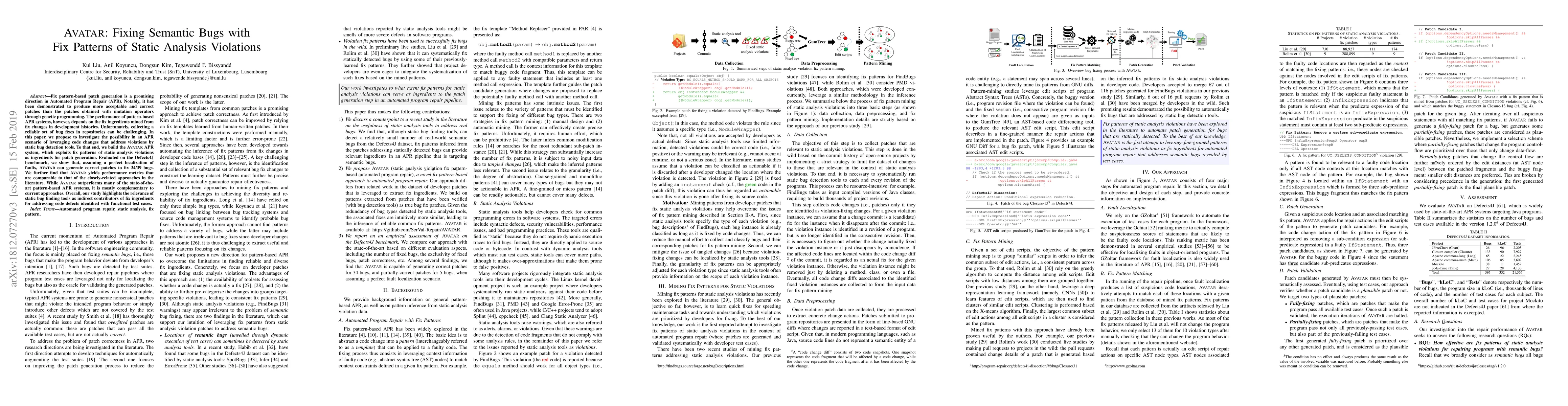 The AVATAR system leverages fix patterns from static analysis violations to generate patches for automated program repair, demonstrating comparable performance to existing methods and highlighting the potential of static bug detection tools in aiding functional test-case-identified defects. Evaluated on Defects4J, AVATAR successfully fixes 34 out of 39 bugs assuming perfect fault localization.