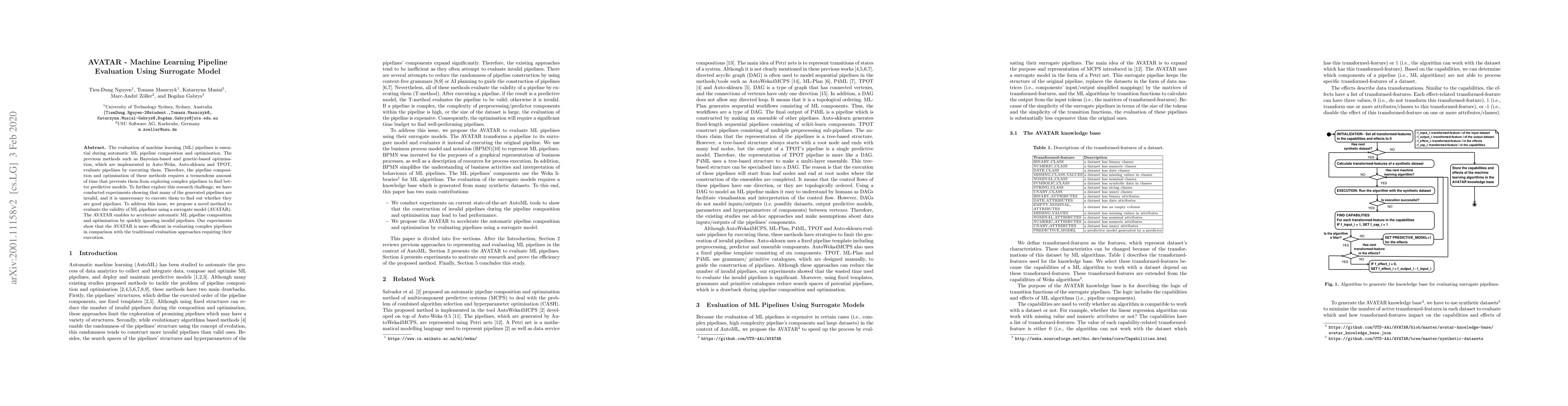 The AVATAR method proposes a surrogate model to evaluate machine learning pipelines, significantly speeding up composition and optimisation by quickly discarding invalid pipelines, thus outperforming traditional execution-based methods. Experiments demonstrate AVATAR's efficiency in handling complex pipelines compared to time-consuming traditional evaluation techniques.