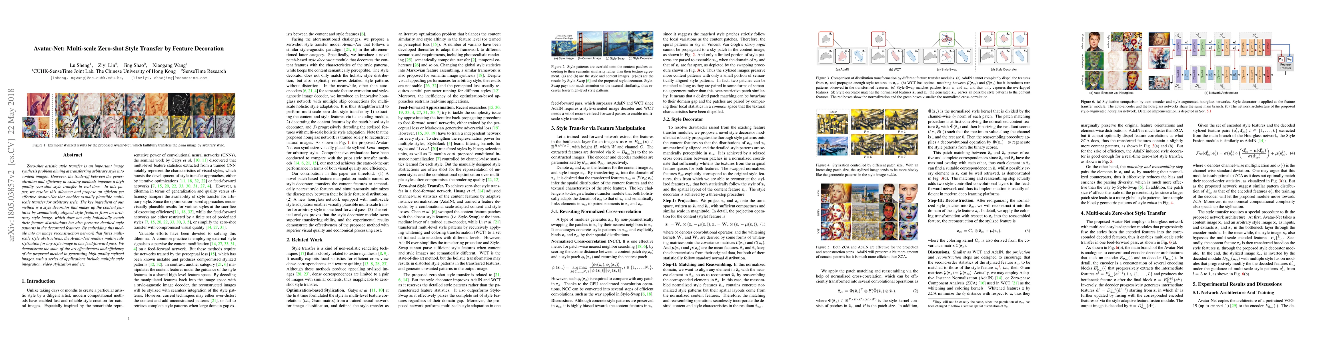 Avatar-Net proposes a novel method for efficient multi-scale zero-shot style transfer by decorating content features with semantically aligned style features, achieving high-quality results in real-time. The method leverages a style decorator and multi-scale feature fusion to enable visually plausible stylization of any style image in a single pass.