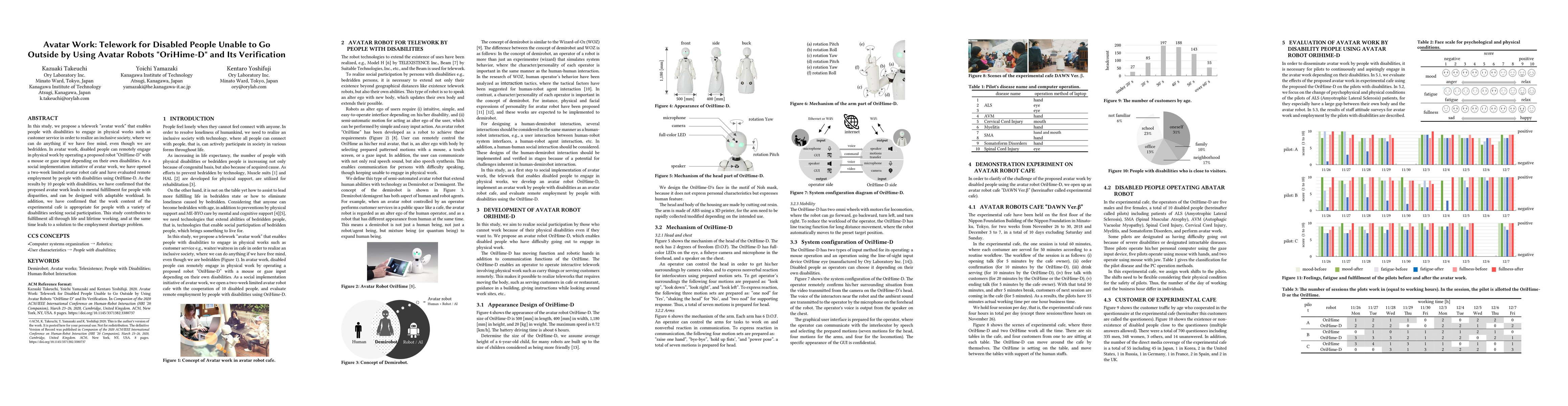 The study proposed 'avatar work' using the 'OriHime-D' robot, enabling disabled individuals to engage in physical work remotely via mouse or gaze input, tailored to their specific disabilities. A two-week experimental avatar robot cafe was conducted to evaluate this concept.