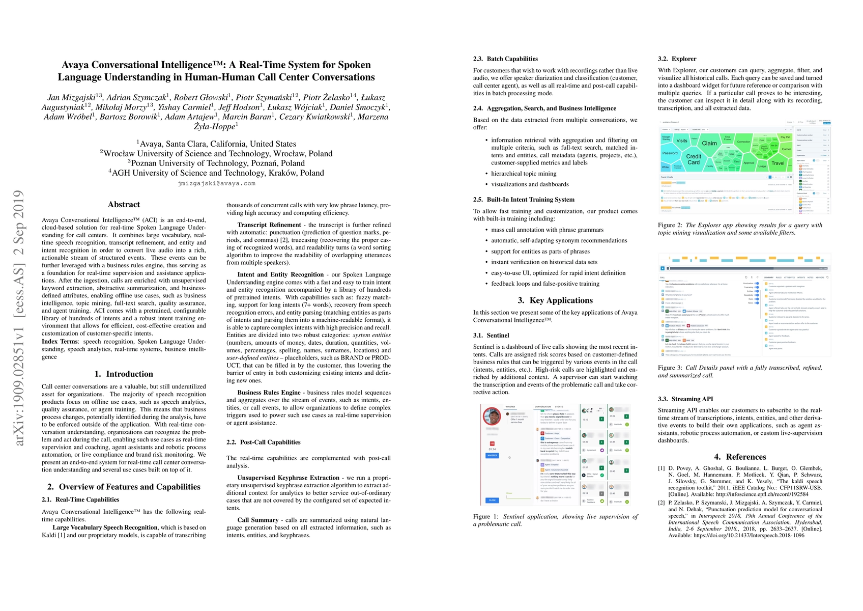 Avaya Conversational Intelligence(ACI) is an end-to-end, cloud-based solution for real-time Spoken Language Understanding for call centers. It combines large vocabulary, real-time speech recognition, transcript refinement, and entity and intent recognition in order to convert live audio into a rich, actionable stream of structured events. These events can be further leveraged with a business rules engine, thus serving as a foundation for real-time supervision and assistance applications. After the ingestion, calls are enriched with unsupervised keyword extraction, abstractive summarization, and business-defined attributes, enabling offline use cases, such as business intelligence, topic mining, full-text search, quality assurance, and agent training. ACI comes with a pretrained, configurable library of hundreds of intents and a robust intent training environment that allows for efficient, cost-effective creation and customization of customer-specific intents.