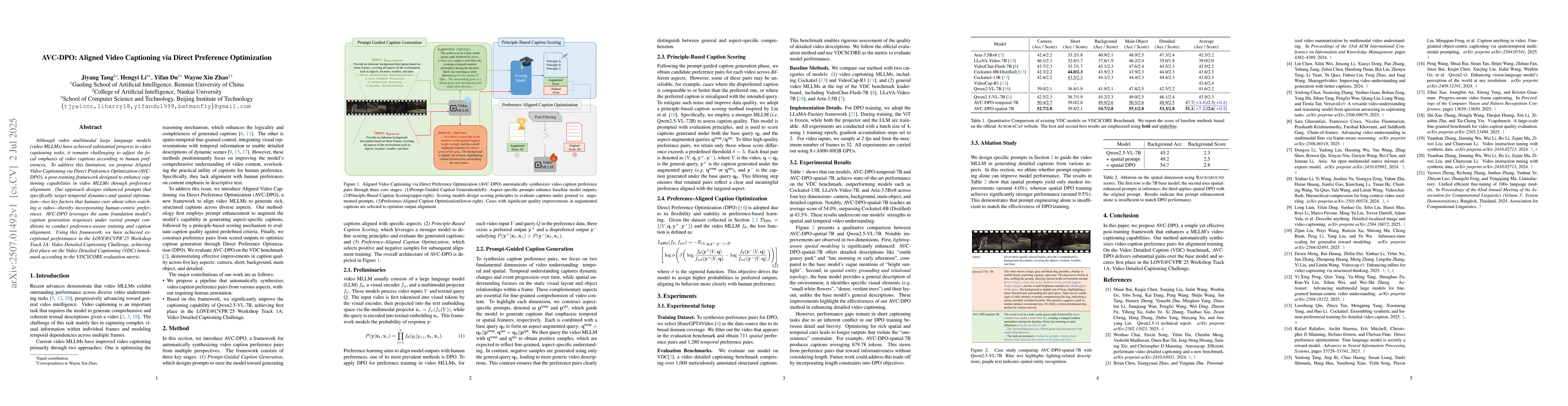 The paper introduces AVC-DPO, a post-training framework for video MLLMs to better align video captions with human preferences. By creating prompts that focus on temporal dynamics and spatial information, AVC-DPO enhances caption generation, achieving top performance in the Video Detailed Captioning challenge.