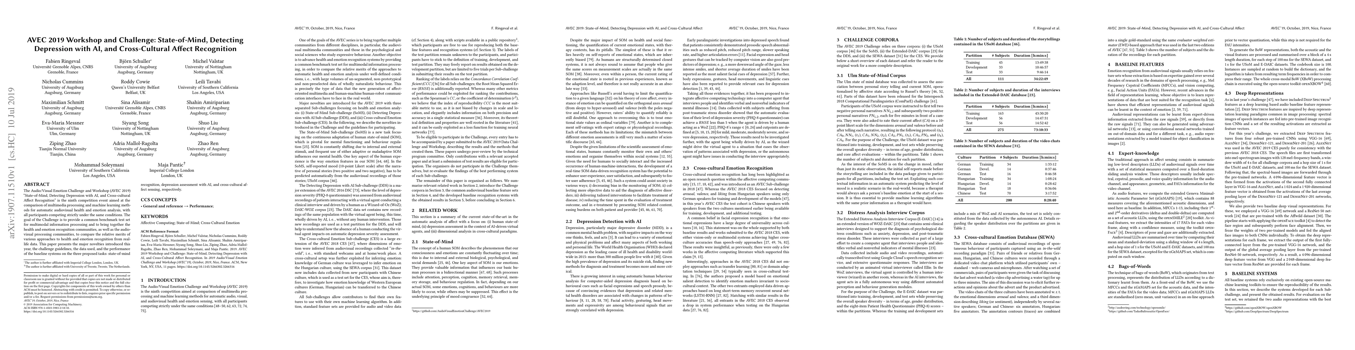 The AVEC 2019 Workshop and Challenge aims to compare AI methods for detecting depression and recognizing emotions across cultures. It presents the year's novelties, guidelines, data, and baseline system performances for tasks on state-of-mind, depression assessment, and cross-cultural affect recognition.