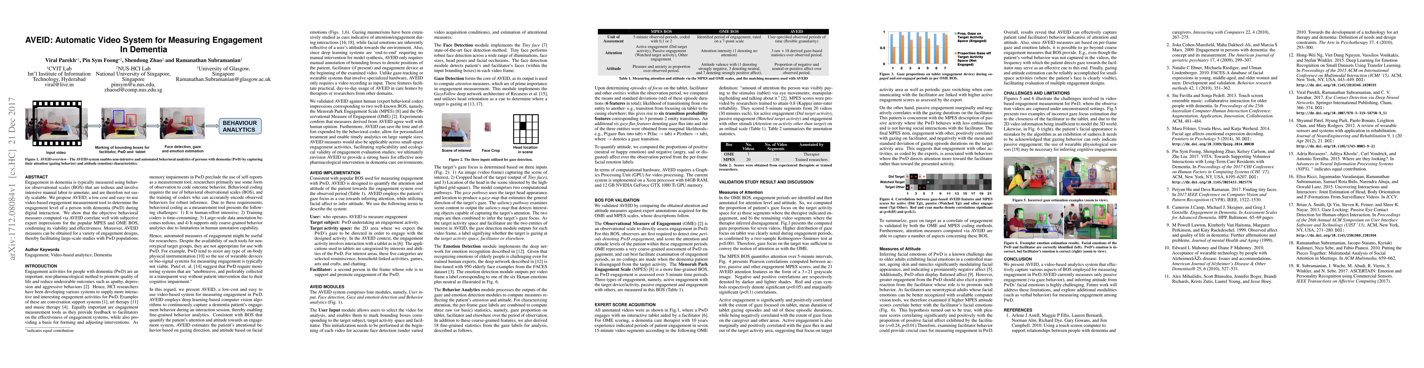 Engagement in dementia is typically measured using behavior observational scales (BOS) that are tedious and involve intensive manual labor to annotate, and are therefore not easily scalable. We propose AVEID, a low cost and easy-to-use video-based engagement measurement tool to determine the engagement level of a person with dementia (PwD) during digital interaction. We show that the objective behavioral measures computed via AVEID correlate well with subjective expert impressions for the popular MPES and OME BOS, confirming its viability and effectiveness. Moreover, AVEID measures can be obtained for a variety of engagement designs, thereby facilitating large-scale studies with PwD populations.