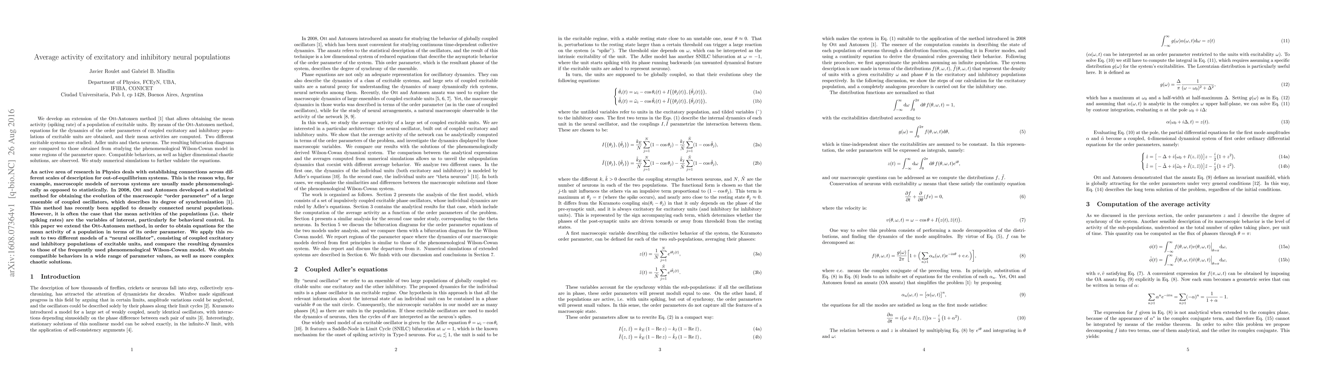 This paper extends the Ott-Antonsen method to compute mean activity in excitatory and inhibitory neural populations, deriving equations for order parameters and comparing bifurcation diagrams with the Wilson-Cowan model, while validating results through numerical simulations.