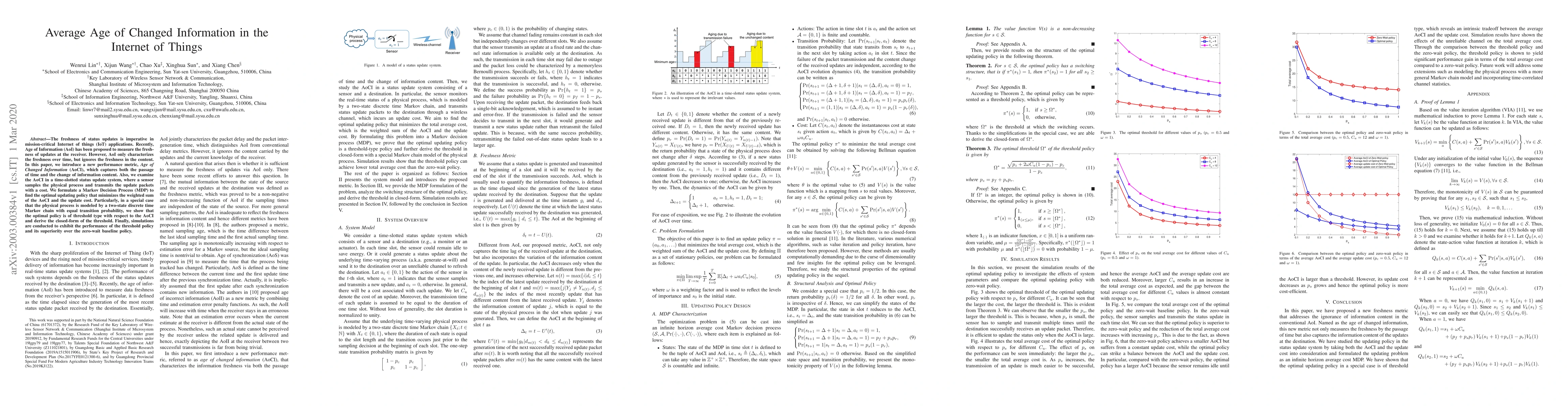 The freshness of status updates is imperative in mission-critical Internet of things (IoT) applications. Recently, Age of Information (AoI) has been proposed to measure the freshness of updates at the receiver. However, AoI only characterizes the freshness over time, but ignores the freshness in the content. In this paper, we introduce a new performance metric, Age of Changed Information (AoCI), which captures both the passage of time and the change of information content. Also, we examine the AoCI in a time-slotted status update system, where a sensor samples the physical process and transmits the update packets with a cost. We formulate a Markov Decision Process (MDP) to find the optimal updating policy that minimizes the weighted sum of the AoCI and the update cost. Particularly, in a special case that the physical process is modeled by a two-state discrete time Markov chain with equal transition probability, we show that the optimal policy is of threshold type with respect to the AoCI and derive the closed-form of the threshold. Finally, simulations are conducted to exhibit the performance of the threshold policy and its superiority over the zero-wait baseline policy.