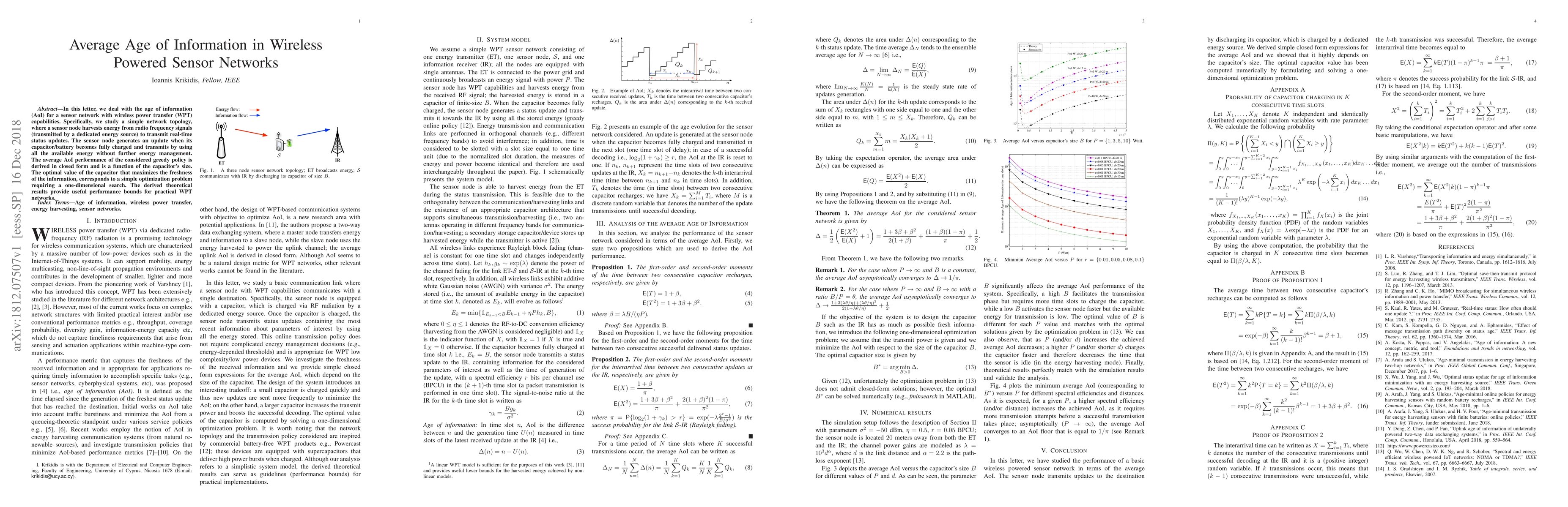 This paper investigates the average age of information (AoI) in wireless powered sensor networks where nodes harvest energy to transmit updates. It derives the AoI performance under a greedy policy and finds the optimal capacitor size to maximize information freshness through a simple optimization problem.