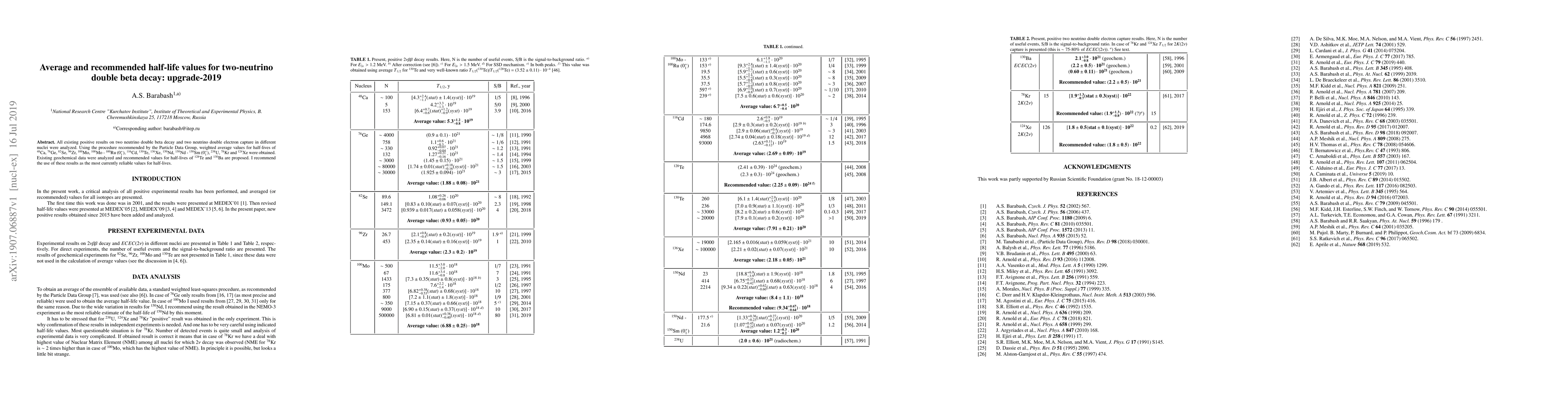 All existing positive results on two neutrino double beta decay and two neutrino double electron capture in different nuclei were analyzed. Using the procedure recommended by the Particle Data Group, weighted average values for half-lives of $^{48}$Ca, $^{76}$Ge, $^{82}$Se, $^{96}$Zr, $^{100}$Mo, $^{100}$Mo - $^{100}$Ru ($0^+_1$), $^{116}$Cd, $^{130}$Te, $^{136}$Xe, $^{150}$Nd, $^{150}$Nd - $^{150}$Sm ($0^+_1$), $^{238}$U, $^{78}$Kr and $^{124}$Xe were obtained. Existing geochemical data were analyzed and recommended values for half-lives of $^{128}$Te and $^{130}$Ba are proposed. I recommend the use of these results as the most currently reliable values for half-lives.