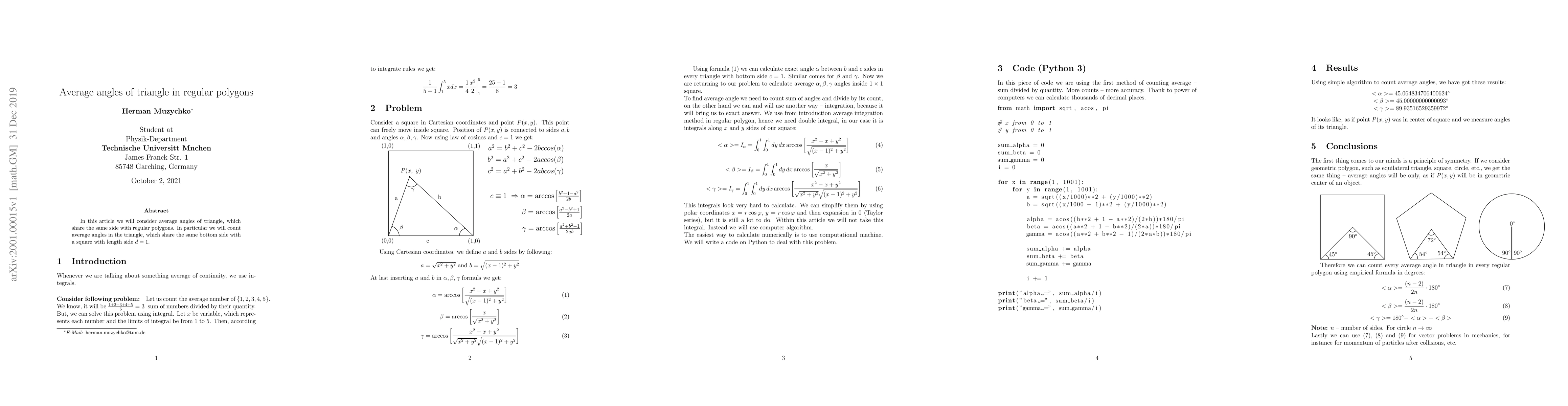 Summary: This paper investigates the average angles of triangles sharing a side with a regular polygon, specifically focusing on triangles with a common base side of length 1 in a square. The study aims to determine the mean angle formed in such configurations.