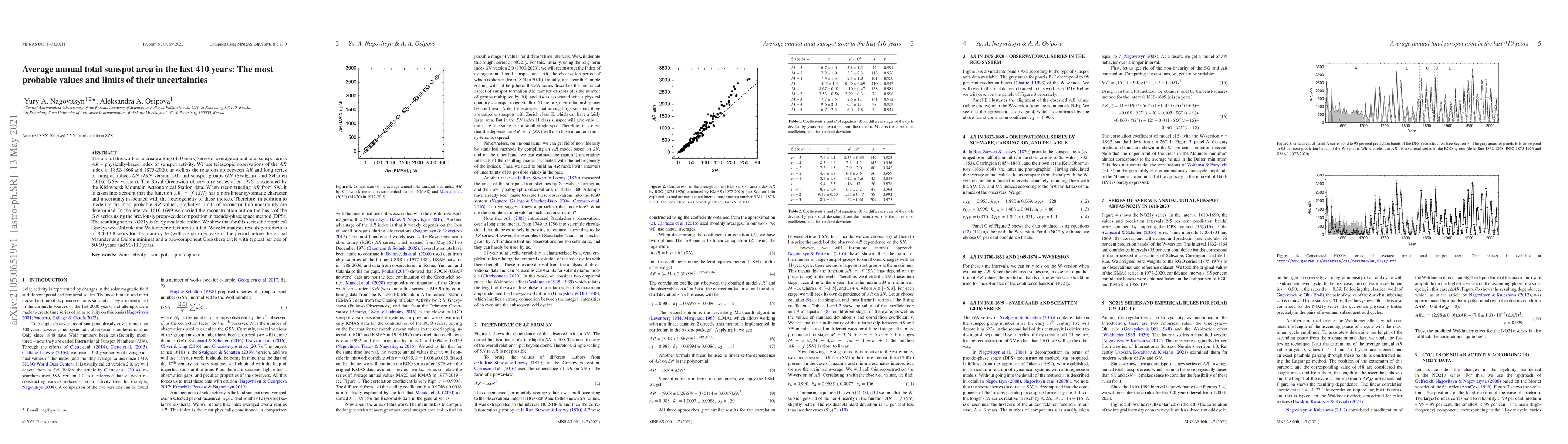 The aim of this work is to create a long (410 years) series of average annual total sunspot areas AR - physically-based index of sunspot activity. We used telescopic observations of the AR index in 1832-1868 and 1875-2020, as well as the relationship between AR and long series of sunspot indices SN (ISN version 2.0) and sunspot groups GN (Svalgaard and Schatten (2016) GSN version). The Royal Greenwich observatory series after 1976 is extended by the Kislovodsk Mountain Astronomical Station data. When reconstructing AR from SN, it is taken into account that the function AR = f (SN) has a nonlinear systematic character and uncertainty associated with the heterogeneity of these indices. Therefore, in addition to modeling the most probable AR values, predictive limits of reconstruction uncertainty are determined. In the interval 1610-1699 the reconstruction we carried out on the basis of the GN series using the previously proposed decomposition in pseudo-phase space method (DPS). The resulting series NO21y is freely available online. We show that for this series the empirical Gnevyshev-Ohl rule and Waldmeier effect are fulfilled. Wavelet analysis reveals periodicities of 8.4-13.8 years for the main cycle (with a sharp decrease of the period before the global Maunder and Dalton minima) and a two-component Gleissberg cycle with typical periods of 50-60 years and 90-110 years.