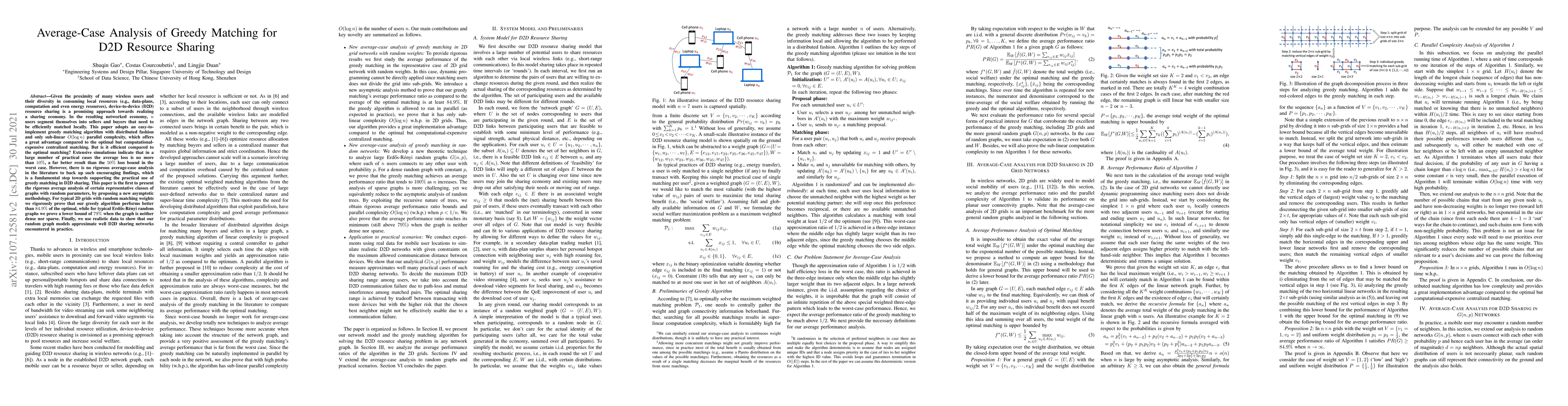 This paper presents the first rigorous average-case analysis of a greedy matching algorithm for device-to-device resource sharing, demonstrating that it performs better than 84.9% of the optimal in typical 2D grids and 79% in typical Erdos-Renyi random graphs, thus supporting its practical use.