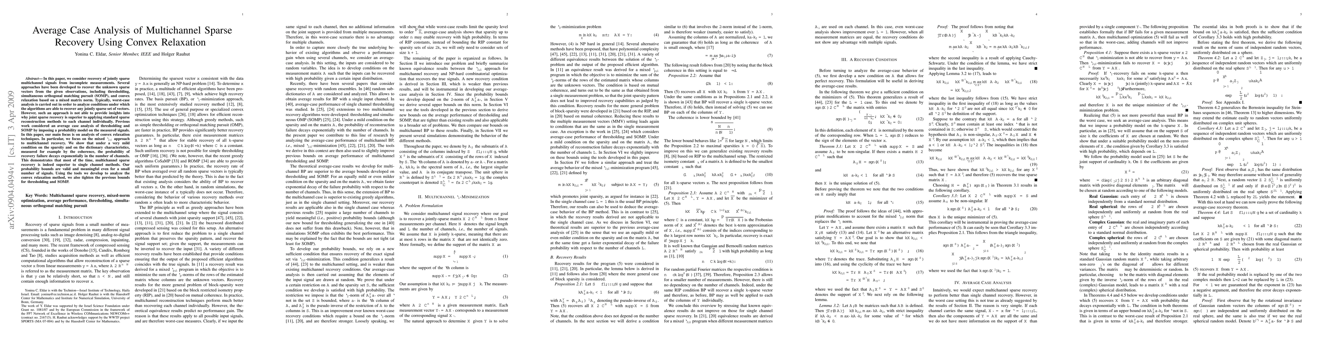 This paper conducts an average case analysis of convex relaxation techniques for jointly sparse multichannel signal recovery, showing that under mild conditions, the probability of recovery failure decreases exponentially with the number of channels, indicating superior performance compared to single-channel methods. The study also improves previous bounds for thresholding and SOMP.