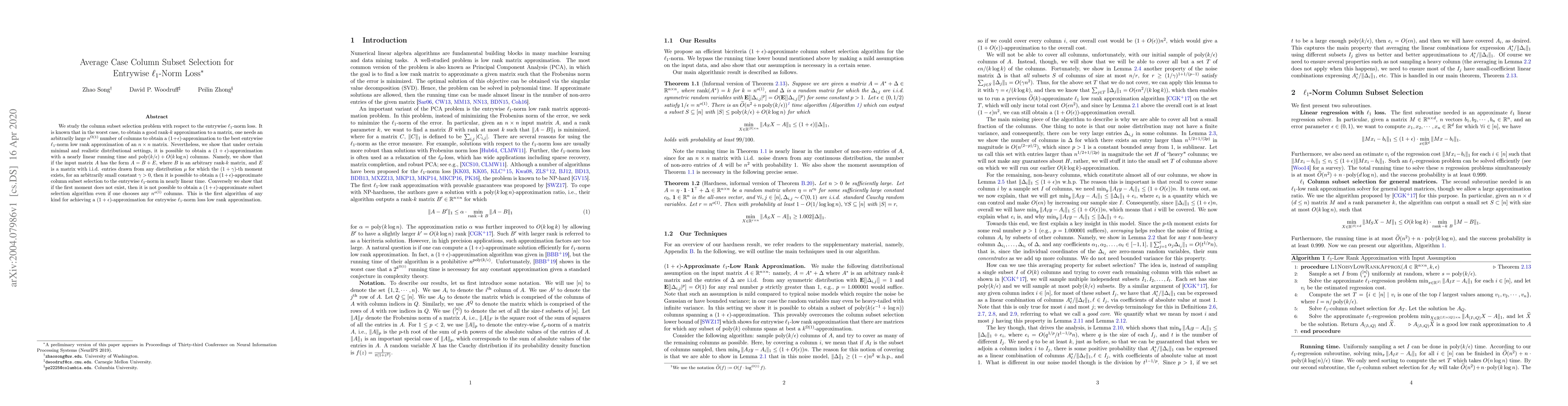 This paper presents an algorithm for column subset selection under entrywise $\ell_1$-norm loss, demonstrating that under realistic distributional settings, a $(1+\epsilon)$-approximation can be achieved with nearly linear running time and poly$(k/\epsilon)+O(k\log n)$ columns, contrasting the worst-case scenario where exponentially many columns are needed.