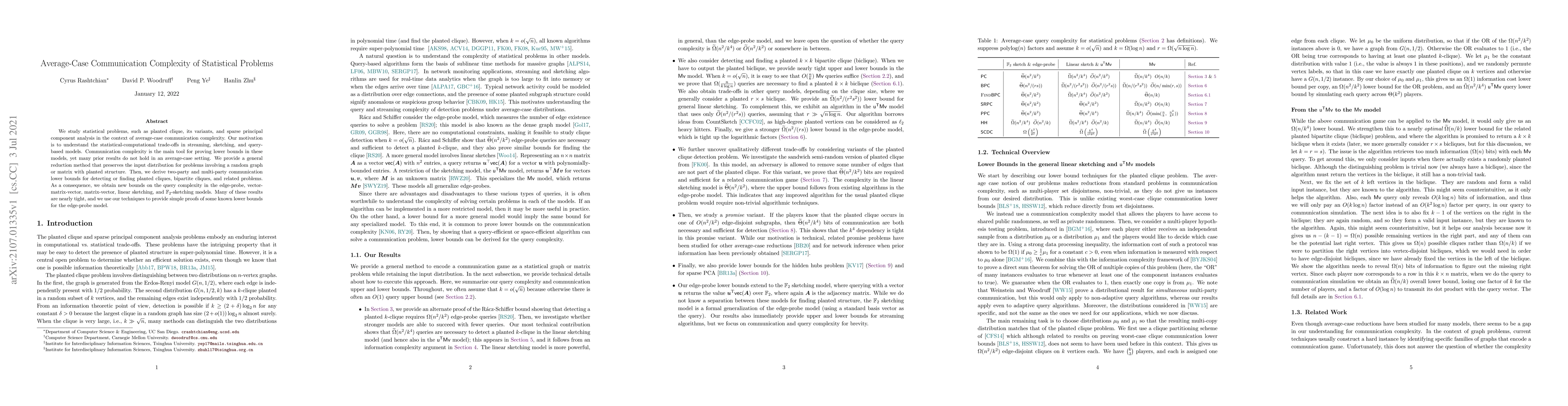 This paper investigates the average-case communication complexity of statistical problems like planted clique and sparse PCA, aiming to understand statistical-computational trade-offs in streaming and query-based models. It introduces a reduction method that maintains input distribution and derives new communication lower bounds for detecting planted structures, leading to tight query complexity bounds in various models.