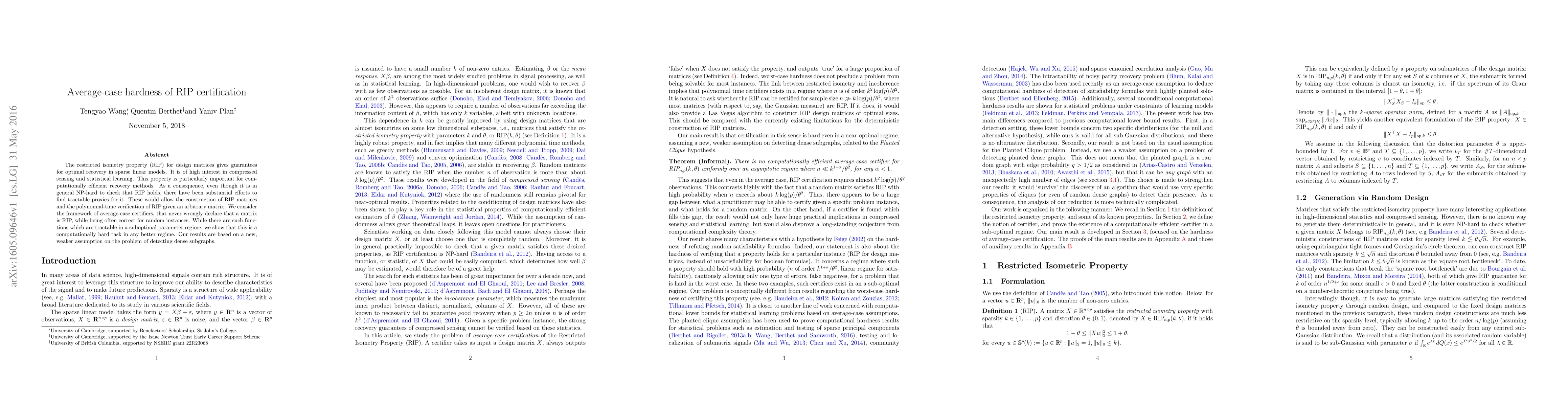 Researchers investigate if it's possible to create average-case certifiers for RIP certification in polynomial time, finding that this task is computationally hard.