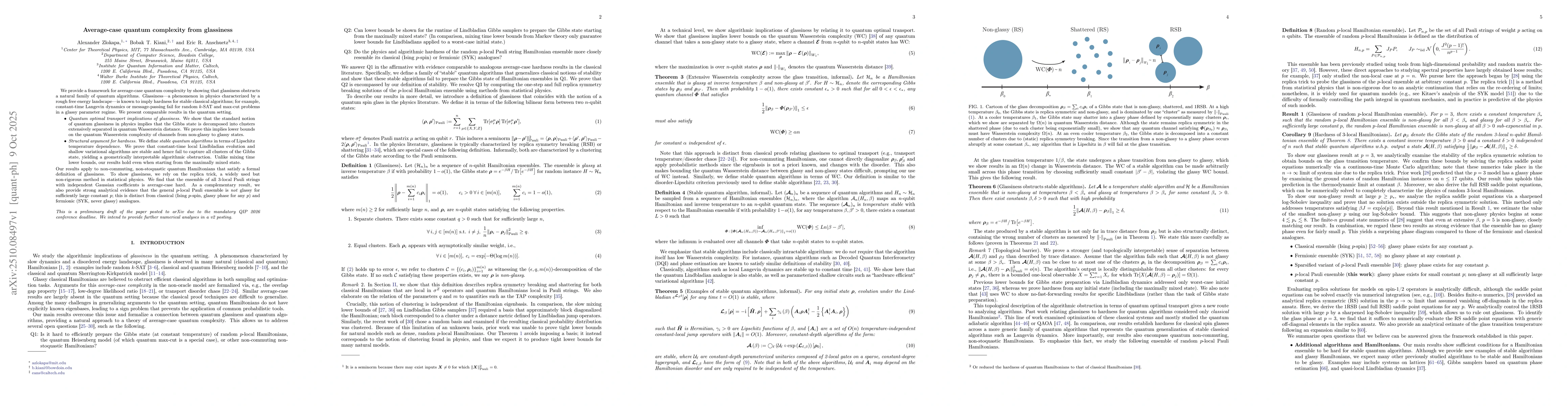 Glassiness -- a phenomenon in physics characterized by a rough free-energy landscape -- implies hardness for stable classical algorithms. For example, it can obstruct constant-time Langevin dynamics and message-passing in random $k$-SAT and max-cut instances. We provide an analogous framework for average-case quantum complexity showing that a natural family of quantum algorithms (e.g., Lindbladian evolution) fails for natural Hamiltonian ensembles (e.g., random 3-local Hamiltonians). Specifically, we prove that the standard notion of quantum glassiness based on replica symmetry breaking obstructs stable quantum algorithms for Gibbs sampling, which we define by a Lipschitz temperature dependence in quantum Wasserstein complexity. Our proof relies on showing that such algorithms fail to capture a structural phase transition in the Gibbs state, where glassiness causes the Gibbs state to decompose into clusters extensively separated in quantum Wasserstein distance. This yields average-case lower bounds for constant-time local Lindbladian evolution and shallow variational circuits. Unlike mixing time lower bounds, our results hold even when dynamics are initialized from the maximally mixed state. We apply these lower bounds to non-commuting, non-stoquastic Hamiltonians by showing a glass transition via the replica trick. We find that the ensemble of all 3-local Pauli strings with independent Gaussian coefficients is average-case hard, while providing analytical evidence that the general $p$-local Pauli ensemble is non-glassy for sufficiently large constant $p$, in contrast to its classical (Ising $p$-spin, always glassy) and fermionic (SYK, never glassy) counterparts.