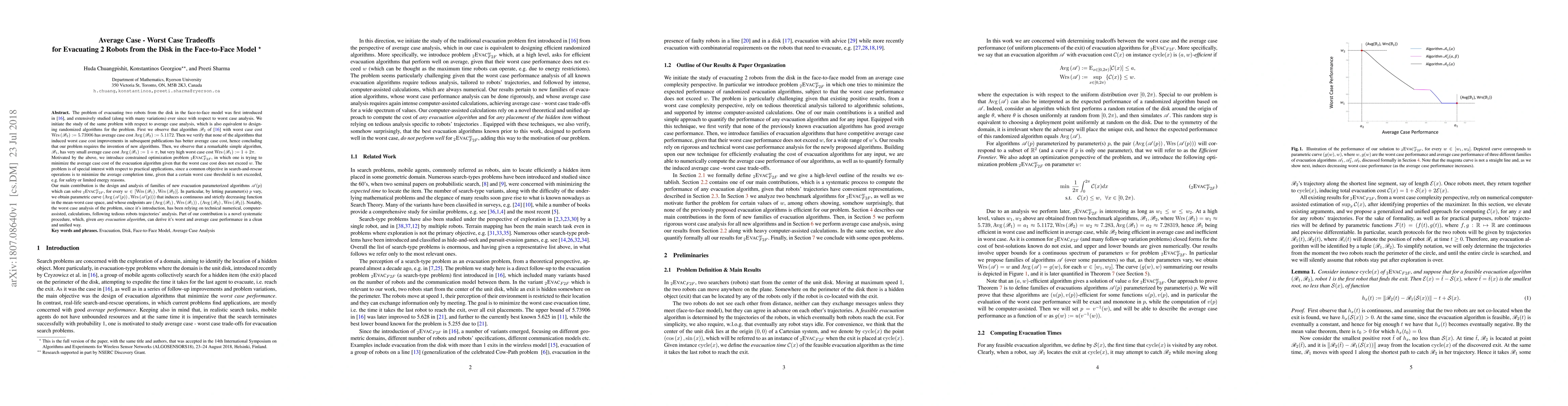 The problem of evacuating two robots from the disk in the face-to-face model was first introduced in [Czyzowicz et al., DISC'14], and extensively studied (along with many variations) ever since with respect to worst case analysis. We initiate the study of the same problem with respect to average case analysis, which is also equivalent to designing randomized algorithms for the problem. First we observe that algorithm $B_{2}$ of~[Czyzowicz et al., DISC'14] with worst case cost $WRS(B_{2}):=5.73906$ has average case cost $AVG(B_{2}):=5.1172$. Then we verify that none of the algorithms that induced worst case cost improvements in subsequent publications has better average case cost, hence concluding that our problem requires the invention of new algorithms. Then, we observe that a remarkable simple algorithm, $B_{1}$, has very small average case cost $AVG(B_{1}):=1+\pi$, but very high worst case cost $WRS(B_{1}):=1+2\pi$. Motivated by the above, we introduce constrained optimization problem $_2Evac_{F2F}^w$, in which one is trying to minimize the average case cost of the evacuation algorithm given that the worst case cost does not exceed $w$. The problem is of special interest with respect to practical applications, since a common objective in search-and-rescue operations is to minimize the average completion time, given that a certain worst case threshold is not exceeded, e.g. for safety or limited energy reasons. Our main contribution is the design and analysis of families of new evacuation parameterized algorithms $A(p)$ which can solve $_2Evac_{F2F}^w$, for every $w \in [WRS(B_{1}),WRS(B_{2})]$.