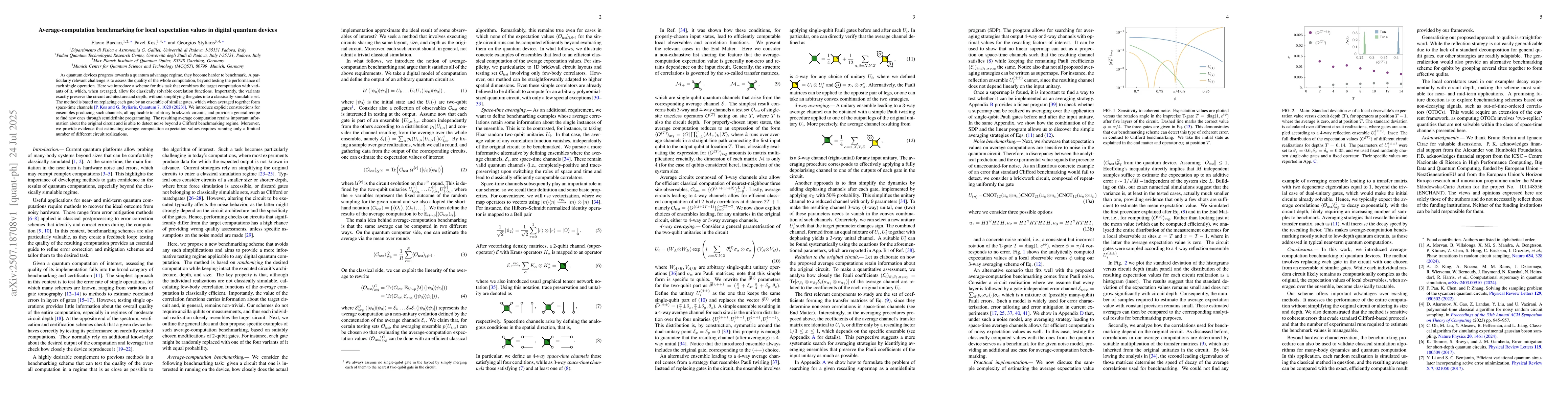 As quantum devices progress towards a quantum advantage regime, they become harder to benchmark. A particularly relevant challenge is to assess the quality of the whole computation, beyond testing the performance of each single operation. Here we introduce a scheme for this task that combines the target computation with variants of it, which, when averaged, allow for classically solvable correlation functions. Importantly, the variants exactly preserve the circuit architecture and depth, without simplifying the gates into a classically-simulable set. The method is based on replacing each gate by an ensemble of similar gates, which when averaged together form space-time channels [P. Kos and G. Styliaris, Quantum 7, 1020 (2023)]. We introduce explicit constructions for ensembles producing such channels, all applicable to arbitrary brickwork circuits, and provide a general recipe to find new ones through semidefinite programming. The resulting average computation retains important information about the original circuit and is able to detect noise beyond a Clifford benchmarking regime. Moreover, we provide evidence that estimating average-computation expectation values requires running only a limited number of different circuit realizations.