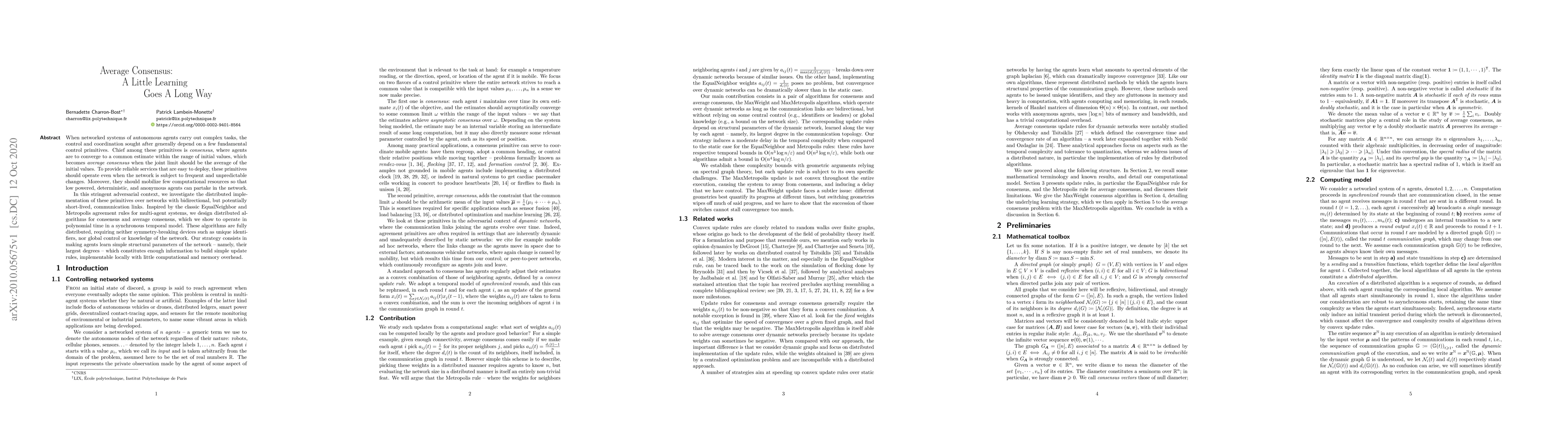 When networked systems of autonomous agents carry out complex tasks, the control and coordination sought after generally depend on a few fundamental control primitives. Chief among these primitives is consensus, where agents are to converge to a common estimate within the range of initial values, which becomes average consensus when the joint limit should be the average of the initial values. To provide reliable services that are easy to deploy, these primitives should operate even when the network is subject to frequent and unpredictable changes. Moreover, they should mobilize few computational resources so that low powered, deterministic, and anonymous agents can partake in the network. In this stringent adversarial context, we investigate the distributed implementation of these primitives over networks with bidirectional, but potentially short-lived, communication links. Inspired by the classic EqualNeighbor and Metropolis agreement rules for multi-agent systems, we design distributed algorithms for consensus and average consensus, which we show to operate in polynomial time in a synchronous temporal model. These algorithms are fully distributed, requiring neither symmetry-breaking devices such as unique identifiers, nor global control or knowledge of the network. Our strategy consists in making agents learn simple structural parameters of the network -- namely, their largest degrees -- which constitutes enough information to build simple update rules, implementable locally with little computational and memory overhead.