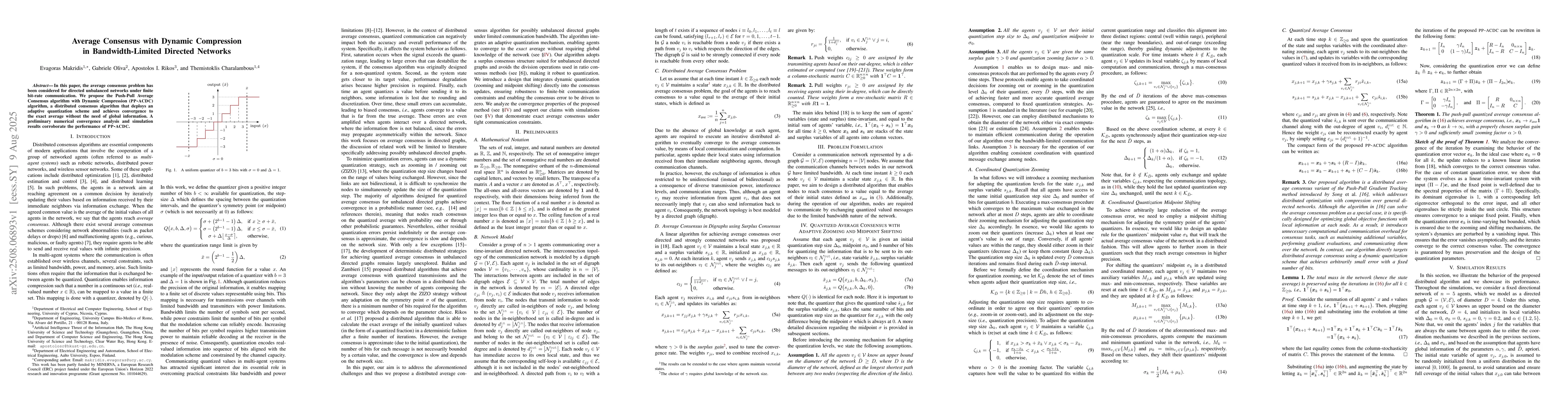 Unlike prior methods that either rely on probabilistic convergence, unbounded message sizes, or fixed quantization strategies, PP-ACDC offers a novel deterministic approach with adaptive quantization, achieving exact average consensus under bandwidth limitations.