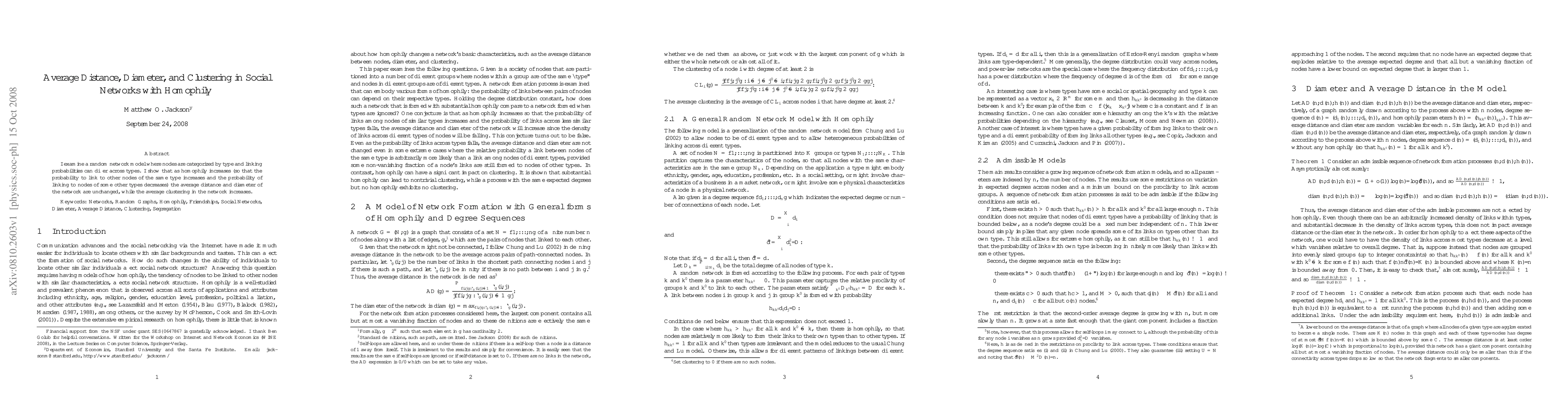This study examines how homophily affects network characteristics in social networks, finding that increased homophily leads to higher clustering while leaving average distance and diameter unchanged.