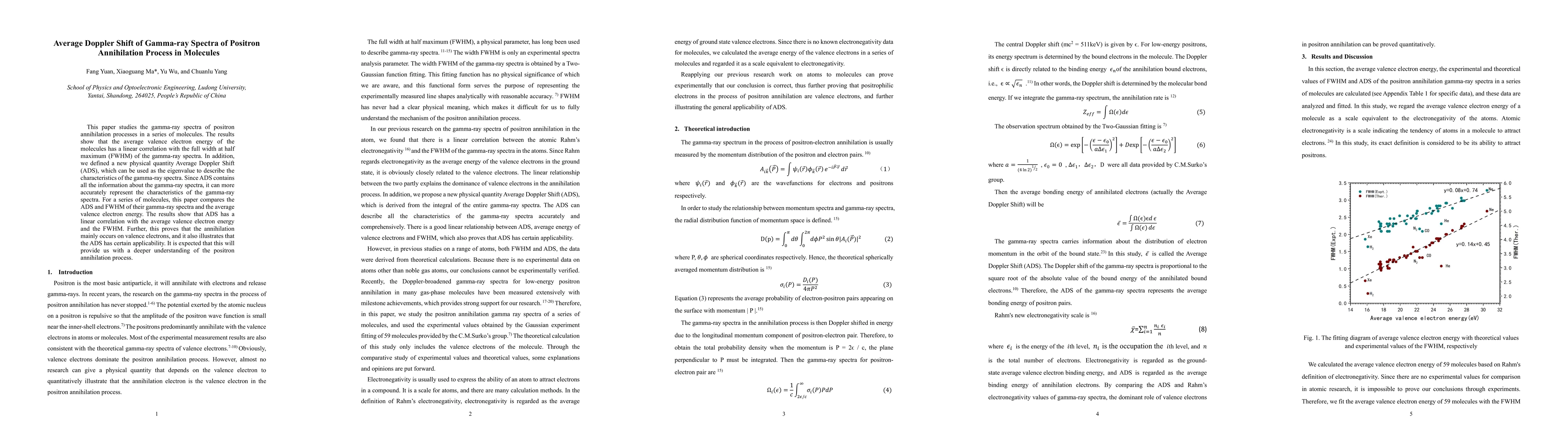 The study calculates the average valence electron energy, experimental and theoretical values of FWHM and ADS of positron annihilation gamma-ray spectra in a series of molecules using Rahm's definition of electronegativity and Gaussian09 computational chemistry package.