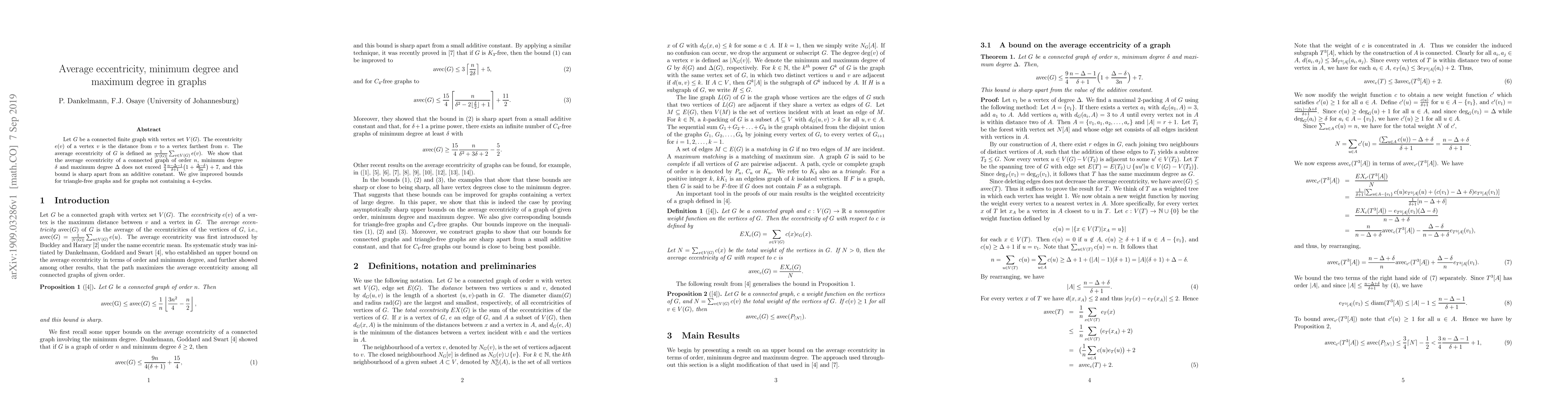 The average eccentricity of a connected graph is bounded above by a specific expression involving its order, minimum degree, and maximum degree, with certain exceptions for triangle-free graphs and those without 4-cycles.