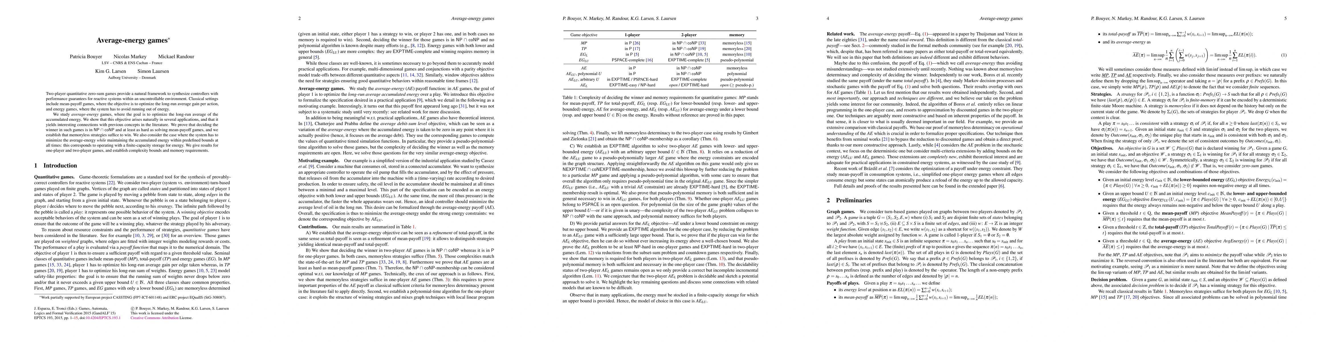 This paper investigates average-energy games, where the objective is to optimize the long-term average of accumulated energy in two-player zero-sum settings. The authors show these games have practical applications and connections to mean-payoff games, proving their complexity and establishing that memoryless strategies suffice to win.