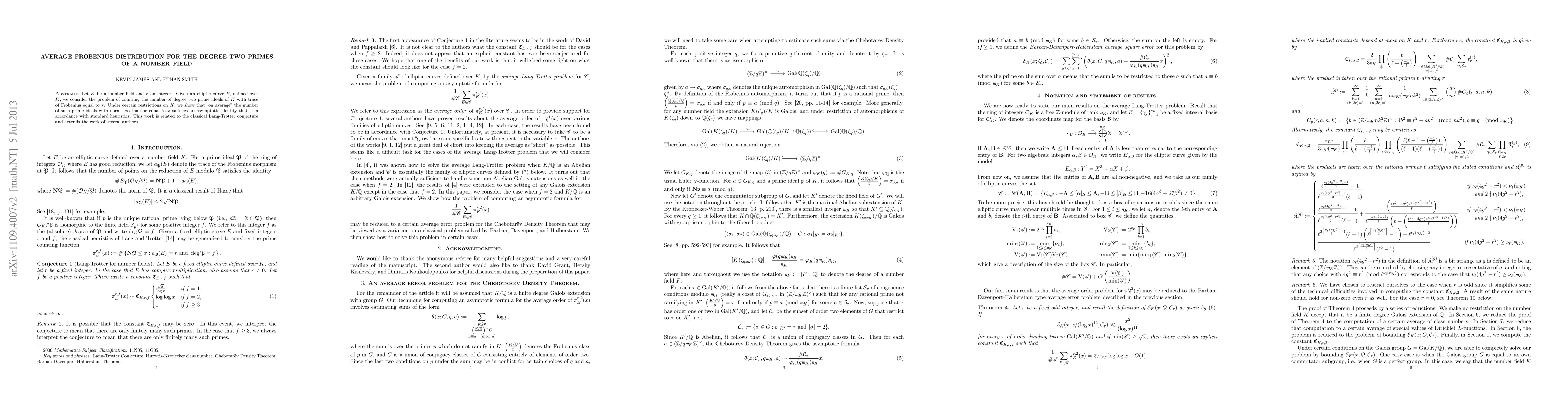Let $K$ be a number field and $r$ an integer. Given an elliptic curve $E$, defined over $K$, we consider the problem of counting the number of degree two prime ideals of $K$ with trace of Frobenius equal to $r$. Under certain restrictions on $K$, we show that "on average" the number of such prime ideals with norm less than or equal to $x$ satisfies an asymptotic identity that is in accordance with standard heuristics. This work is related to the classical Lang-Trotter conjecture and extends the work of several authors.