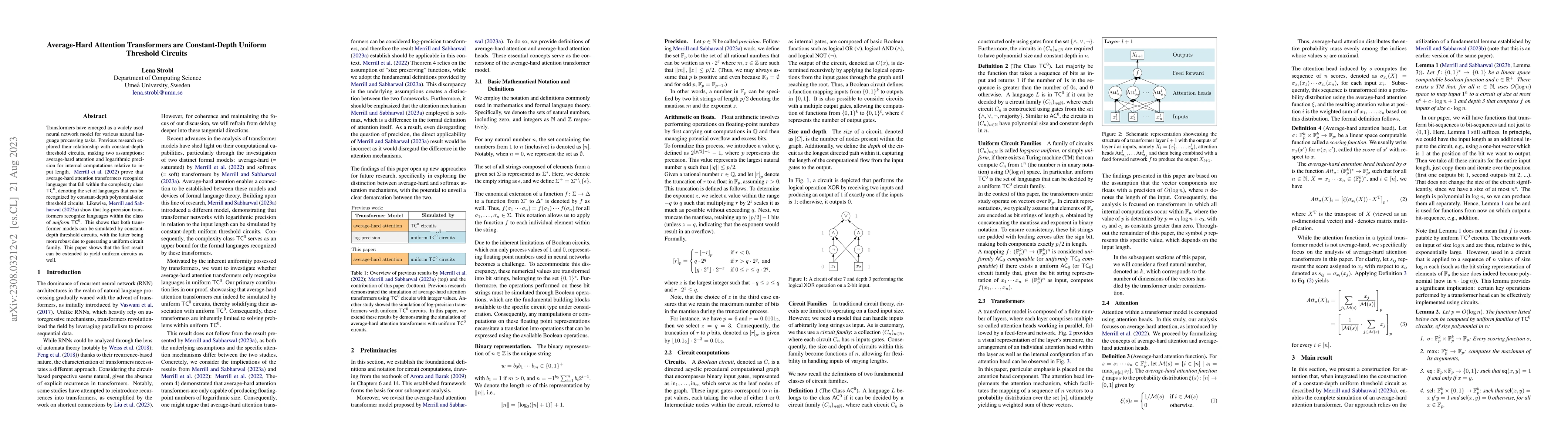 Transformers have emerged as a widely used neural network model for various natural language processing tasks. Previous research explored their relationship with constant-depth threshold circuits, making two assumptions: average-hard attention and logarithmic precision for internal computations relative to input length. Merrill et al. (2022) prove that average-hard attention transformers recognize languages that fall within the complexity class TC0, denoting the set of languages that can be recognized by constant-depth polynomial-size threshold circuits. Likewise, Merrill and Sabharwal (2023) show that log-precision transformers recognize languages within the class of uniform TC0. This shows that both transformer models can be simulated by constant-depth threshold circuits, with the latter being more robust due to generating a uniform circuit family. Our paper shows that the first result can be extended to yield uniform circuits as well.