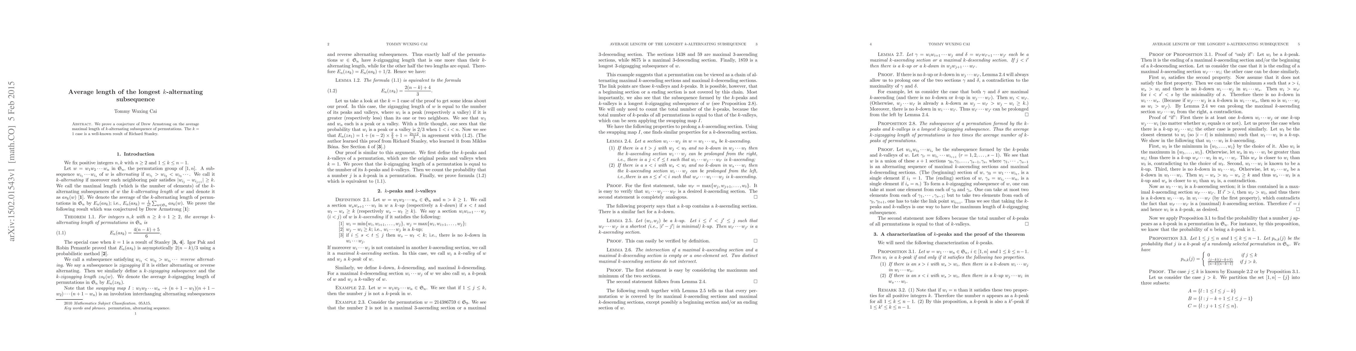 Summary: The paper proves Drew Armstrong's conjecture on the average length of the longest $k$-alternating subsequence in permutations, extending Richard Stanley's well-known result for $k=1$.