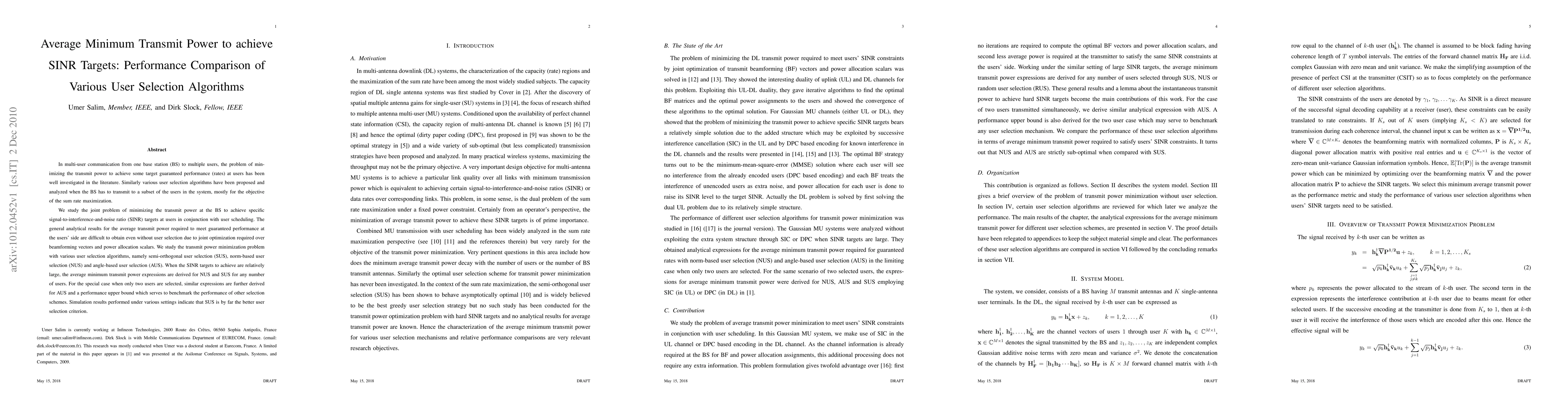 This paper explores the average minimum transmit power required to achieve specific SINR targets in multi-user communication systems, comparing various user selection algorithms: semi-orthogonal, norm-based, and angle-based. Simulation results show that semi-orthogonal user selection (SUS) generally outperforms the others in minimizing transmit power.